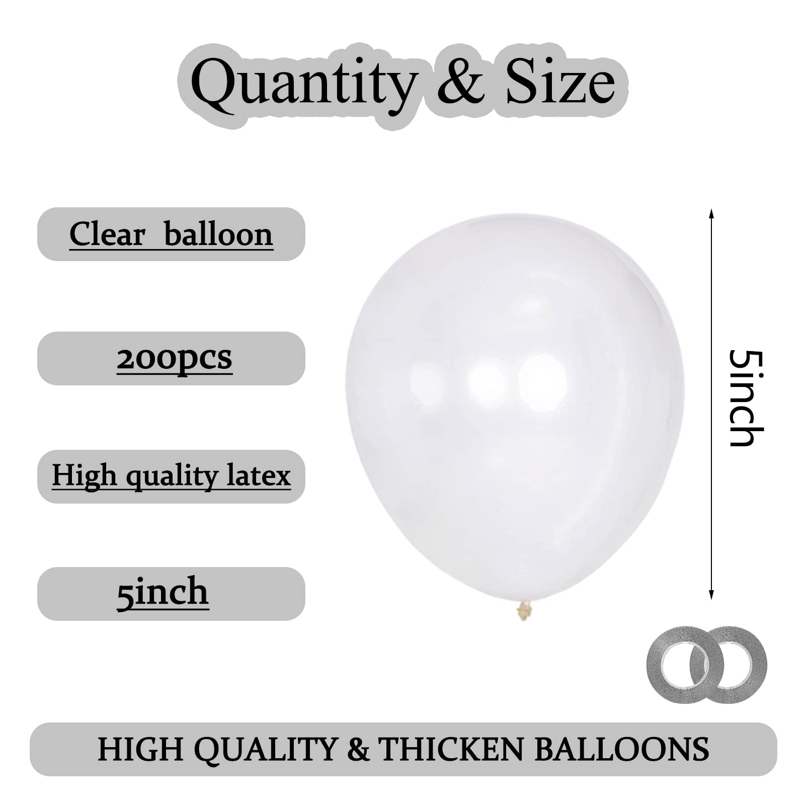 - Q: How many balloons come in a single set? A: Each set includes 200 pieces of 5-inch clear balloons along with two rolls of ribbon for your decoration needs.
