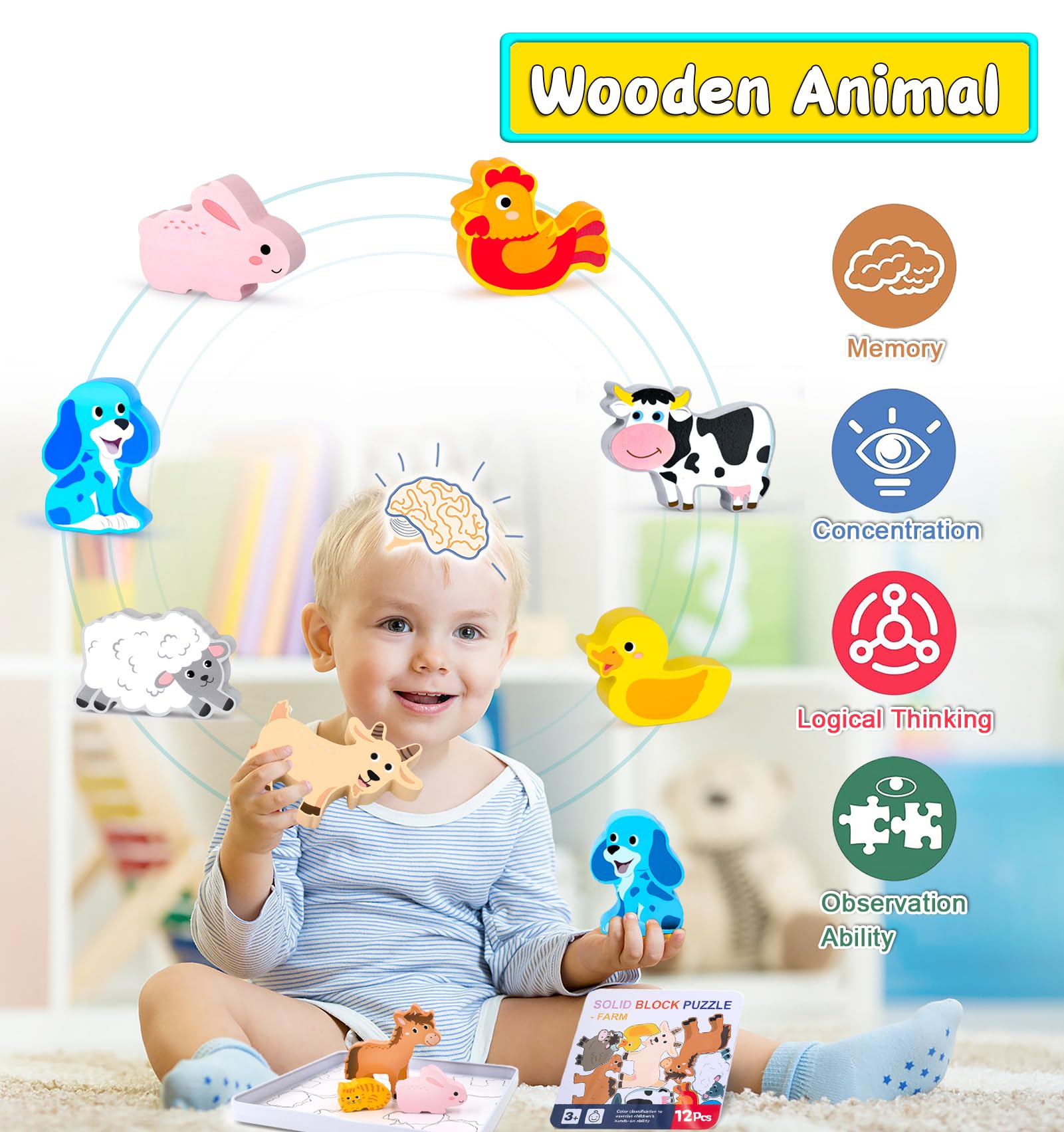 KECIABO Wooden Animal Puzzles Toys for Toddlers,12 Pcs Farm Animal Figures,Animal Matching Sorting Stacking Toys for Boys Child