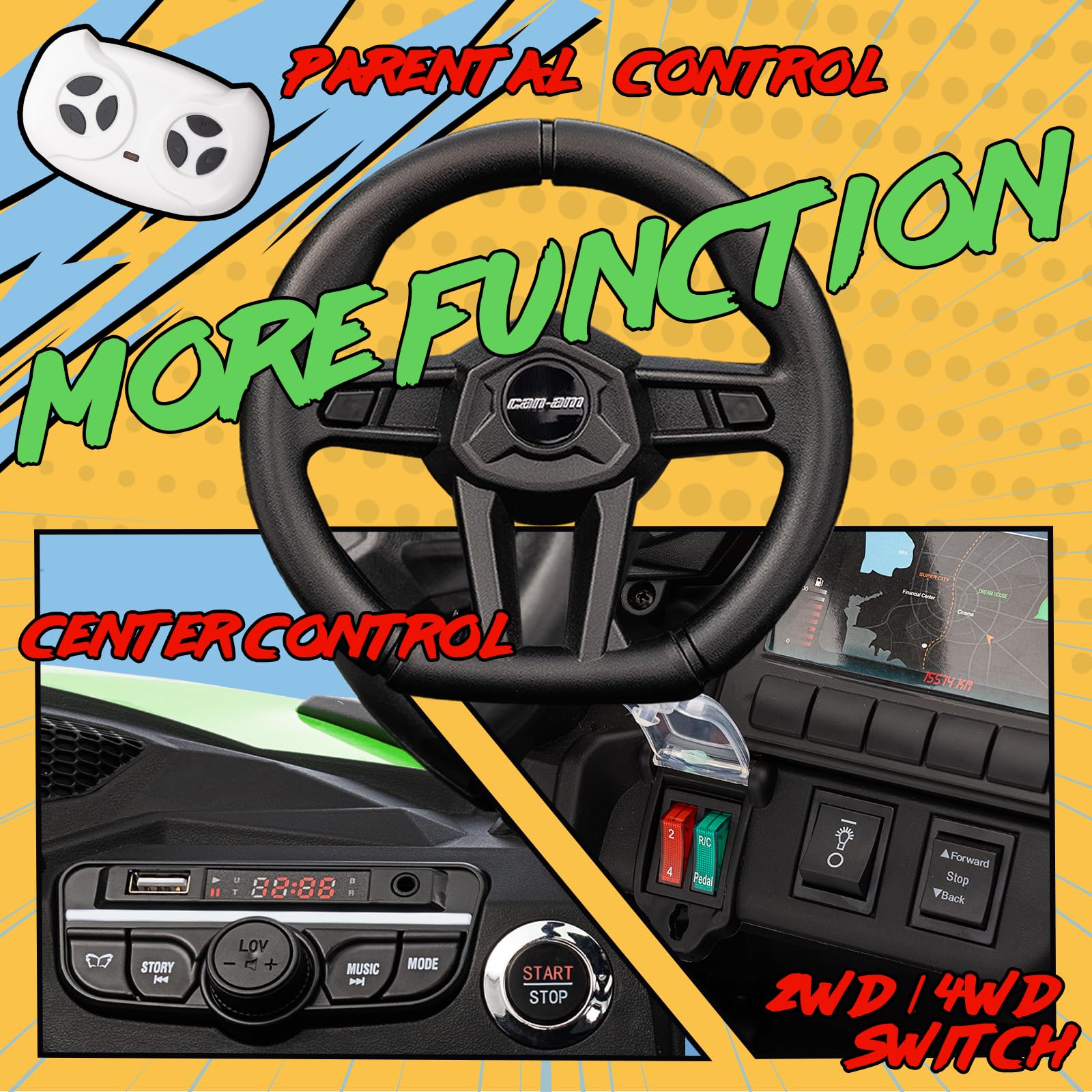 Are you looking for a fun luxury car with a unique style? 24V Battery -24V large rechargeable batteries provide more stable and sufficient power. 4WD/2WD is switchable - allowing versatility in different driving conditions.     Four-wheel drive (4WD) provides better traction and stability on rough terrain, while two-wheel drive (2WD) is more effective for smoother driving on smoother surfaces. LED - The LED light design enhances the realism of the UTV, especially in situations where there is insufficient light This riding UTV - built-in music driving, support USB and MP3 connection, make the driving experience more interesting. The ideal gift for any holiday: Charging time: 8-10 hours Travel time: 1-2 hours Parent remote control: 2.4G remote control Overall dimensions: 42.5 inches (L) x 29 inches (W) x 25 inches (H) Let's start a fun driving journey! Attention: Remote controls should be operated by adults, not children