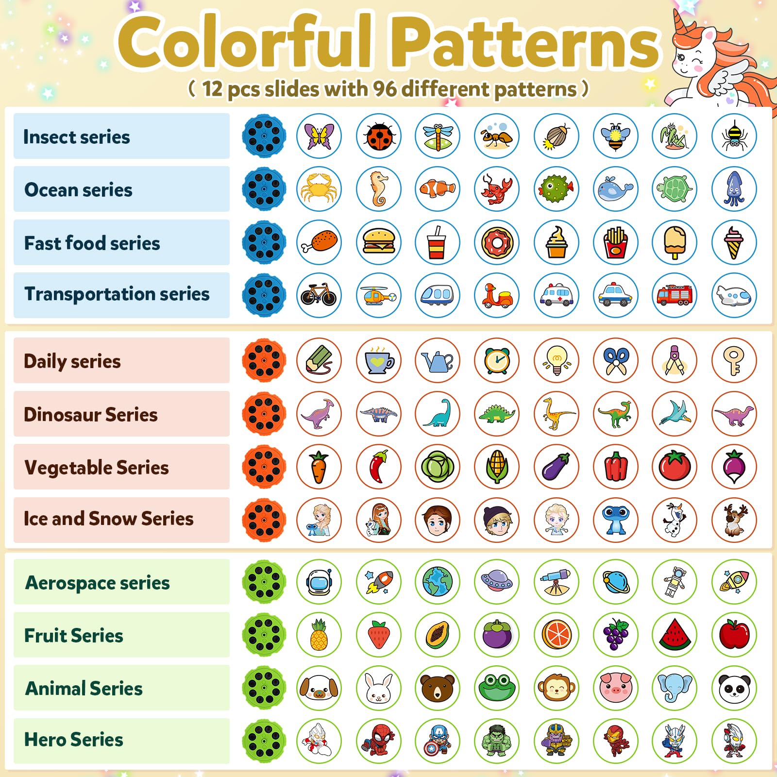 KETIEE Unicorn Drawing Projector for Kids, Art Projector Drawing Toddler Toy with 96 Colorful Patterns for 3-8 Years Old Kids Are You Looking for A Fun Drawing And Learning Toy for Your Child? The unicorn drawing projector will be the perfect choice for you. The painting projection set for kids has a cute shape and soft lighting, allowing children to enjoy painting while exercising their creativity, imagination and hands-on skills. Its a great educational toy for your child at Christmas and birthday! More Picture Discs (12 Slides with 96 Different Patterns) Trace and Draw Projector Toy come with 12 slides (Fruits, Vegetables, Foods, Animals, Heros, Frozen,Dinosaurs, Ocean, Traffic), 96 different patterns. kids can switch as they like and immersed in them, learn to draw, recognize patterns and feel colors, improve your kids creativity and imagination, exercise hand-eye coordination & color perception ability. Our Projector Toy is very cute and fun,They can play for a long time. Easy to Use The Kids Drawing Board Projector Table is a fun and easy way to draw! Turn down the lights, switch on the projector, insert a preprinted slide and trace away. Then colour in or paint the picture.Project an image that your child can draw along the picture. Cultivate Interest Children are naturally fond of graffiti, which can enable them to develop creativity in all aspects of creation. This toy can make your children show their own artistic style.