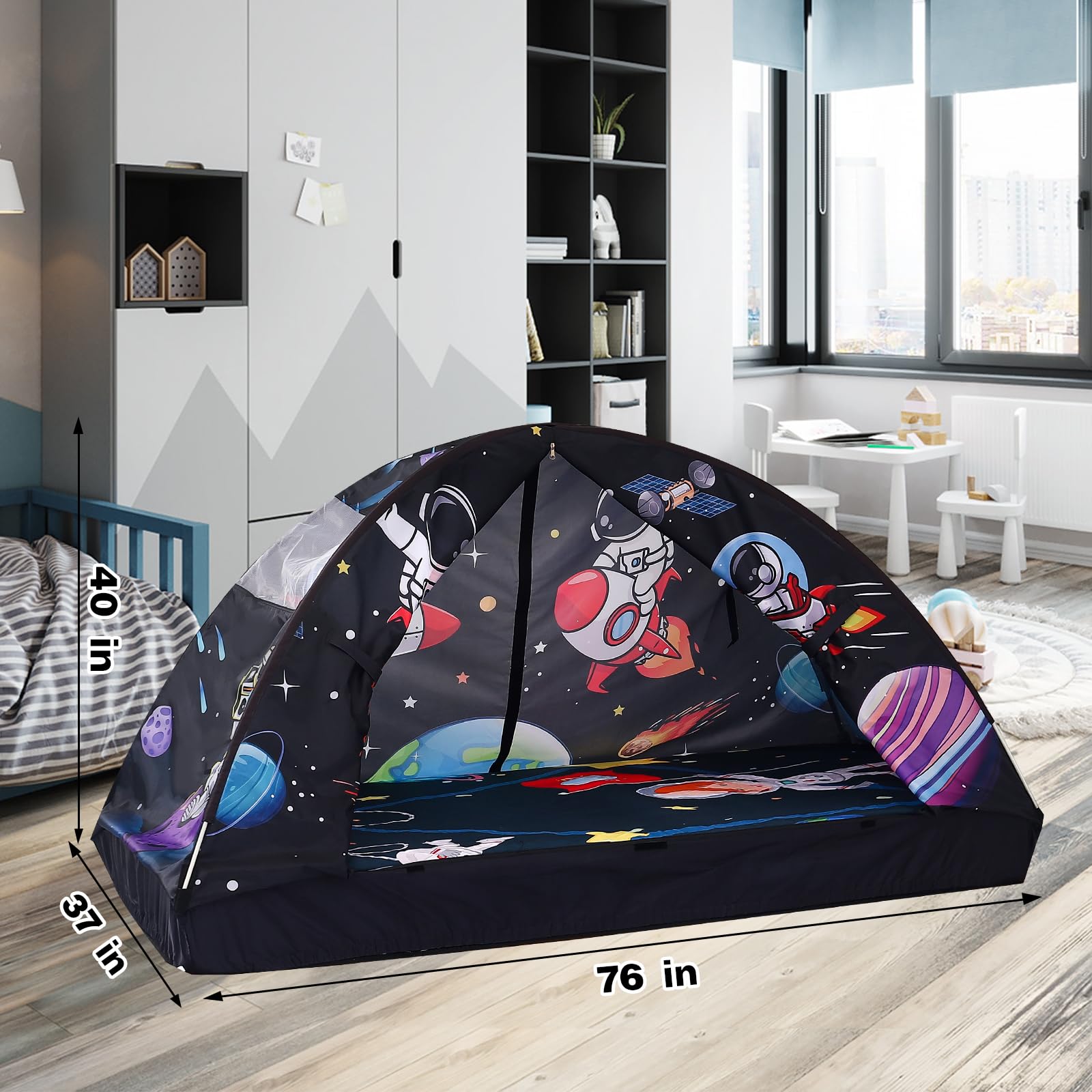 - Q: What are the dimensions of the Kid Bed Tent? A: The Kid Bed Tent measures 75” x 36” x 39”, making it a perfect fit for most twin-sized beds while providing ample space for your child to play and sleep.