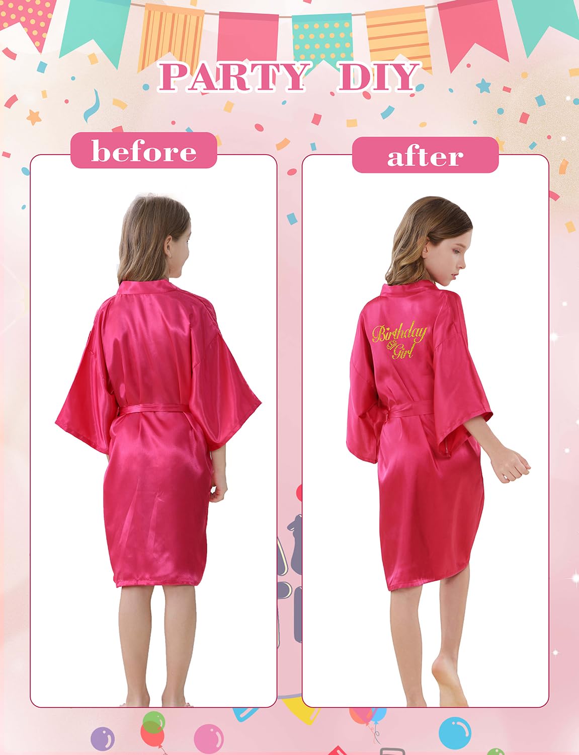 Soft Fabric: This girl robe is made of enhanced polyester which is soft and gentle to your skin. Childs robe is light smooth breathable and very durable. Your angel can wear it every morning and night and feels all the ease and comfort your girl need from a robe. | Elegant Design: This pretty robe is simple yet classic. Junior robe comes with belt loops and sashes with which your girl can easily tie a bow-knot. The fabric looks lustrous and feels like satin.The eye mask and hair band are made of satin material which is soft and comfortable.If your little princess like simplicity this might be a perfect choice for her. | Multiple Occasions: Suitable for bridal party night gown morning gown loungewear sleepwear bathrobe etc. | Size and Color: We have different colors and sizes you can choose from. Meet your different needs. | Sets include:1pcs kid robes 1pcs eyemask 1pcs hairband 1pcs hair ring.Makeup spa parties that can satisfy children.