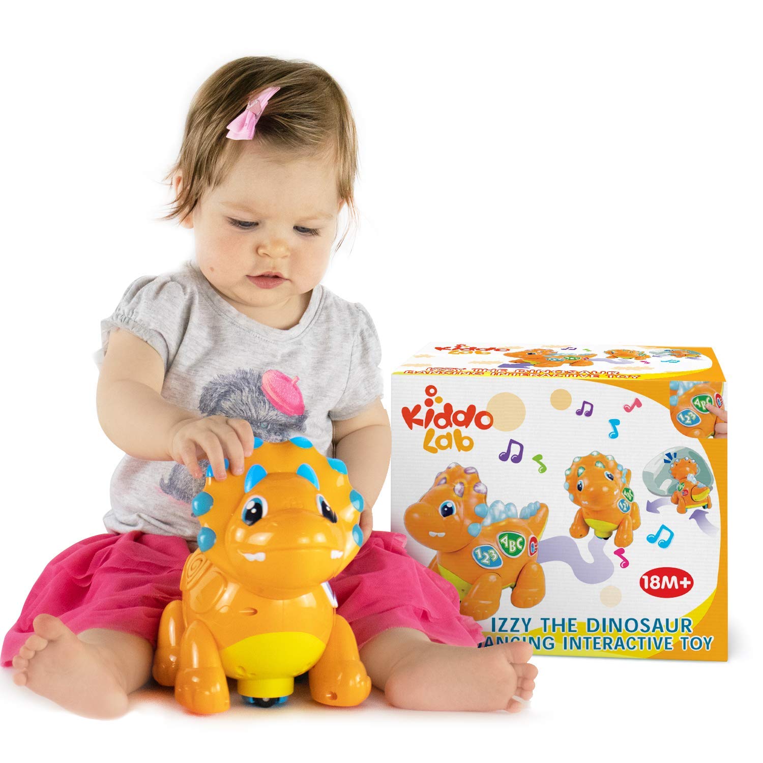 WALKING, DANCING DINO BUDDY: Take your toddler back to the Jurassic period with this adorable dinosaur companion. Izzy is fully interactive, walking, dancing, moving his head and wagging his tail. Intended for ages eighteen months and up. | MOVES AROUND OBSTACLES: If Izzy runs into an obstruction, he turns in a new direction and keeps right on walking! | EDUCATIONAL LEARNING FUN: Engineered to be both fun and educational, this cute dinosaur toy helps developing babies and toddlers with a learning mode as well as a musical mode. | LIGHT, SOUND, AND MUSIC: This brightly adorned orange dinosaur friend lights up and plays fun sound effects as well as cheerful musical melodies. | SAFE AND DURABLE CONSTRUCTION: Made from BPA-Free materials, this prehistoric critter is completely safe for toddlers to experience and explore in all the ways that curious babies do.