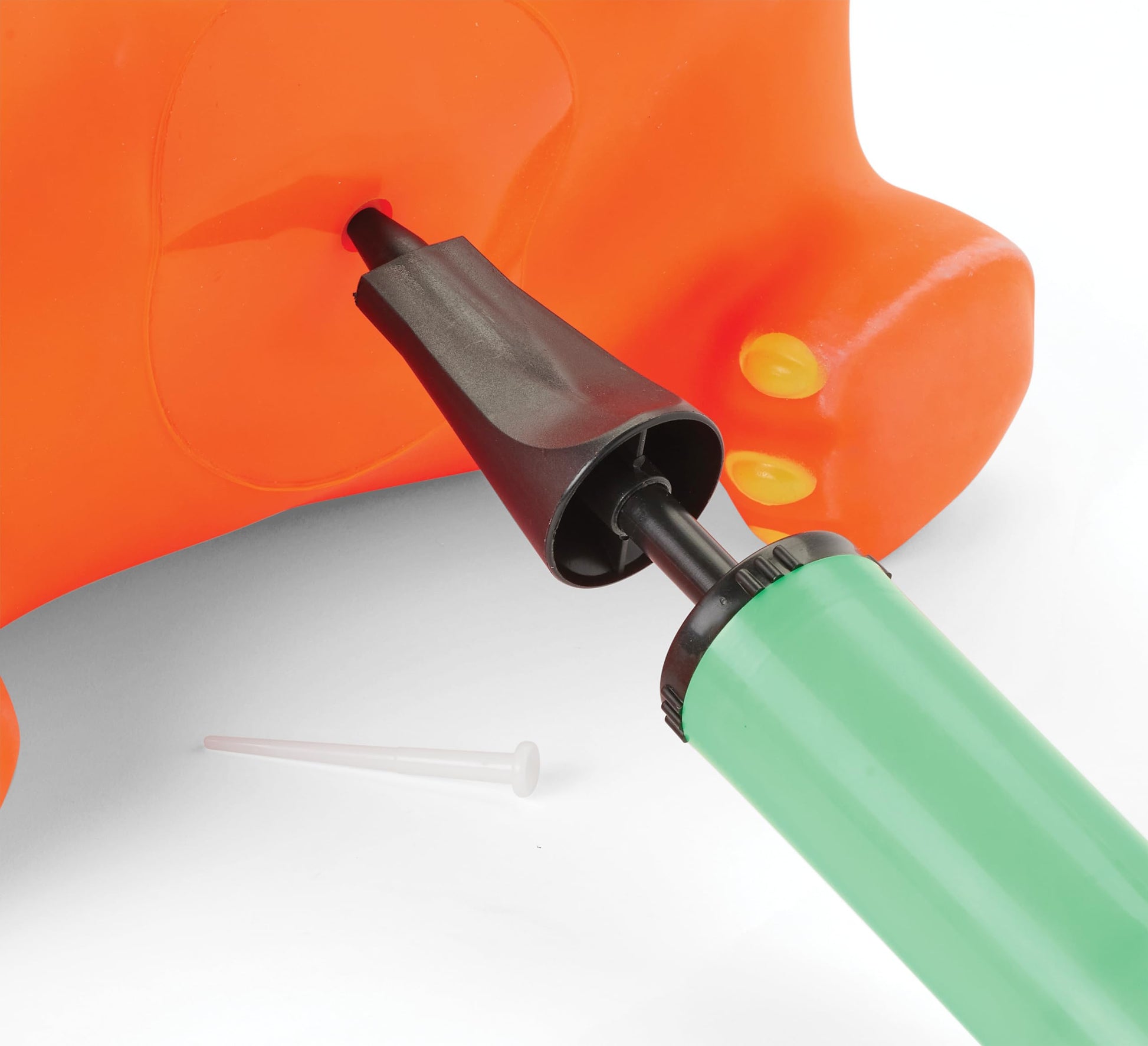 Saddle up for dino-sized fun with the Bounce Around Dino! This inflatable bouncer brings dino-sized fun indoors or out! Toddlers bounce and explore on this inflatable pal's back, while low-profile design ensures safe stomping grounds. Easy inflation and cleaning make Dino a parent's dream too! Saddle up for prehistoric playtime adventures!