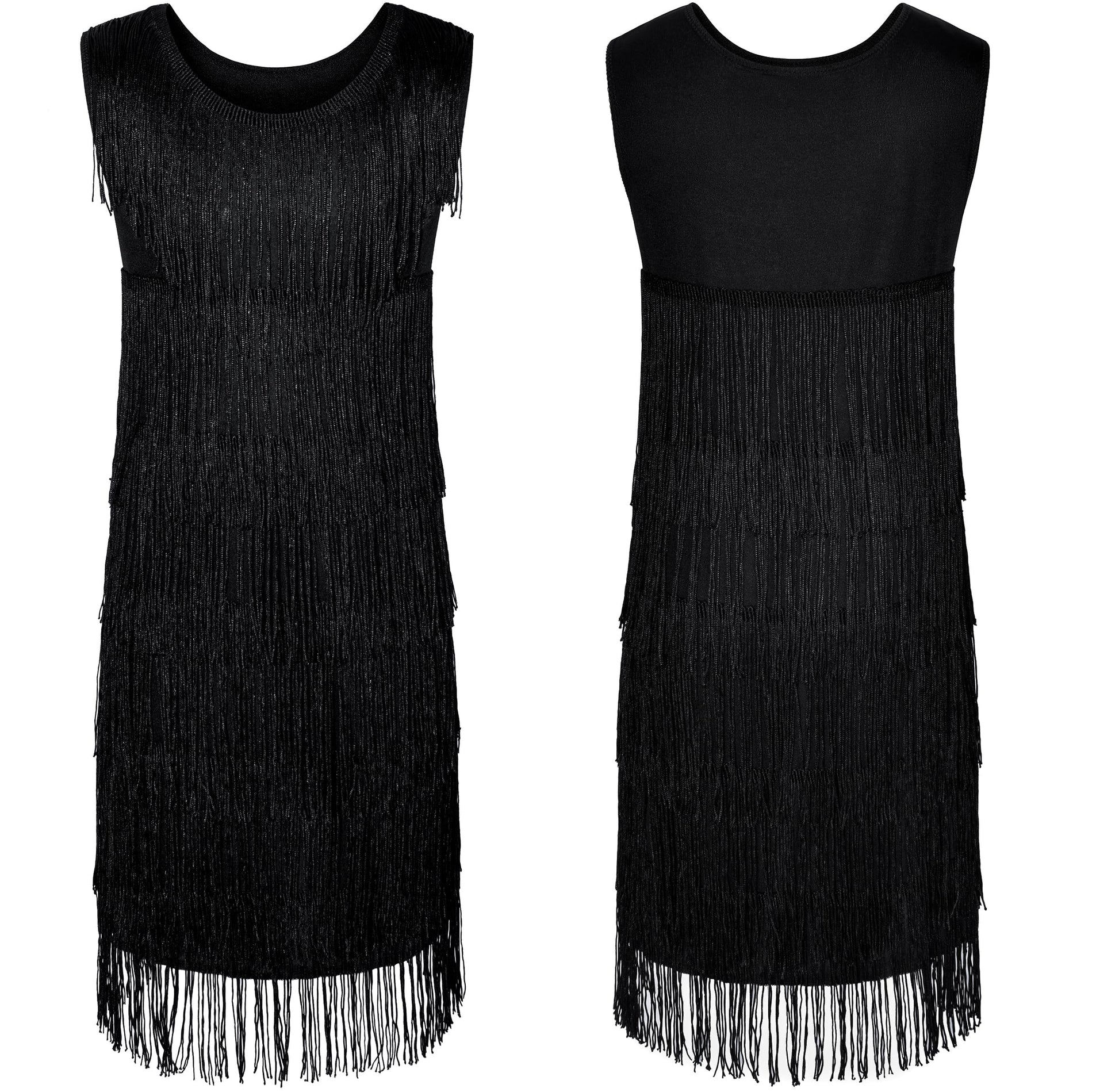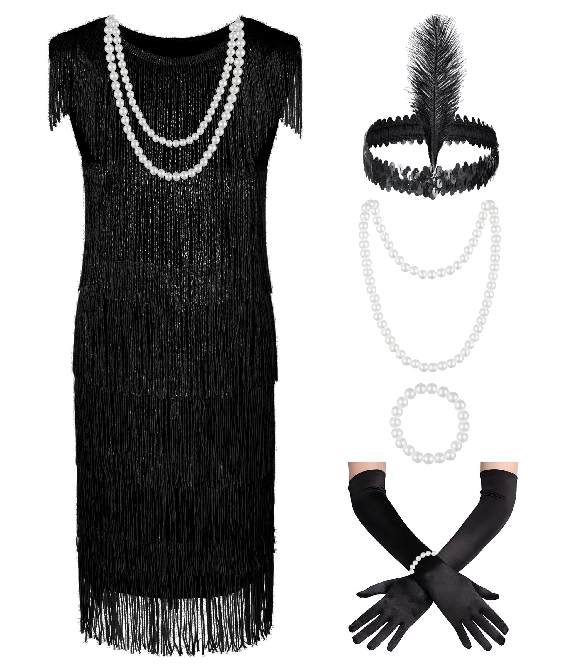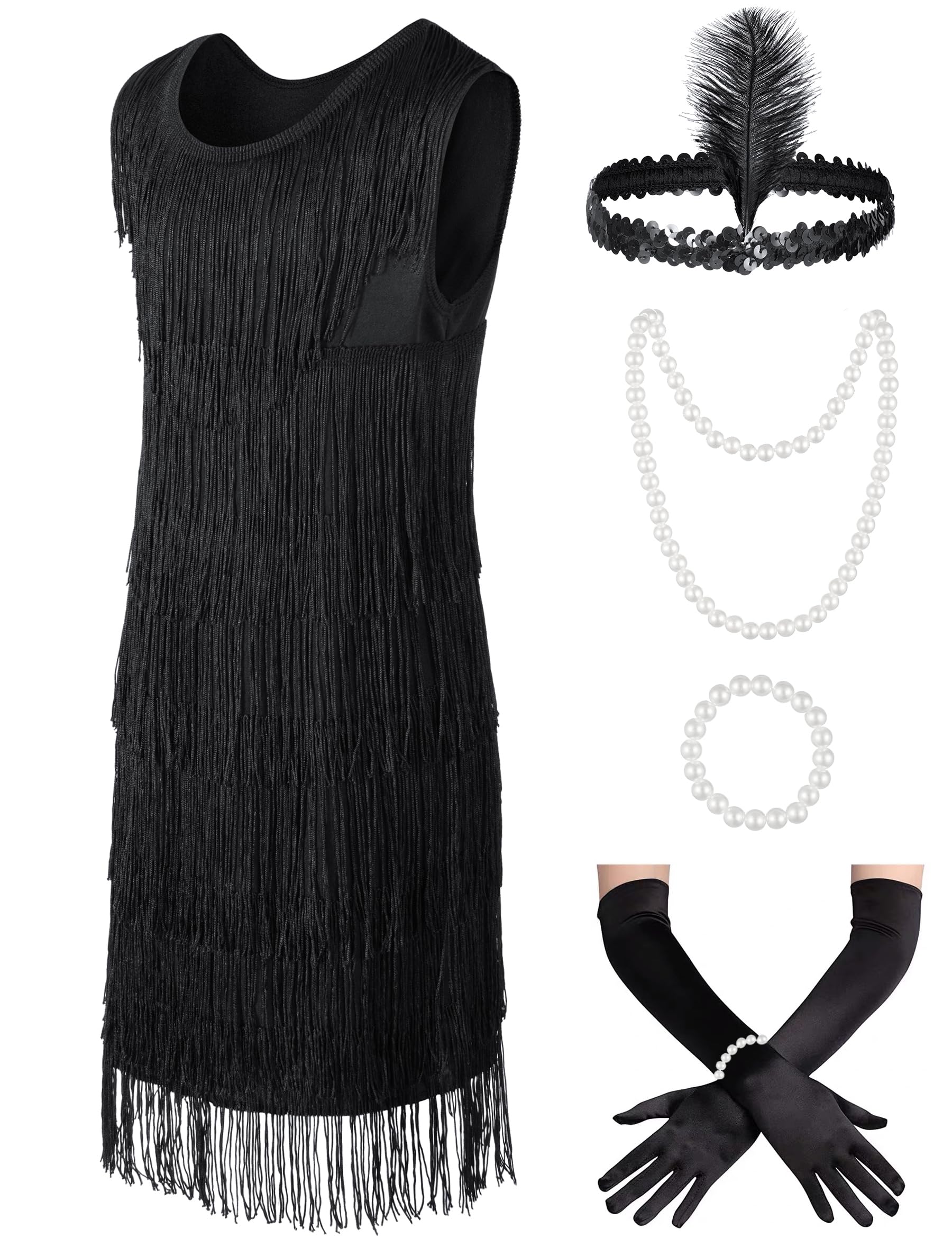 ?Package include?: 1*Tassel fringe dress,1*F eather Headband,2*Long Satin Gloves,1*Neck lace,1*Bracelet. | ?Design?: Vintage 1920s modern style.Round neckline and sleeveless design allow for freedom of movement for the arms and shoulders. The six-tier fringe design adds to the vintage elegance. | ?Material?: Dress and Gloves:Polyester,Satin,Spandex. Other accessories:Plastics pearl. | ?Size?: Suitable for most children aged 4-12 Years. | ?Occasion?Perfect for vintage 1920's party cosplay, Flappers role play, Prom,Concert, Birthday, Halloween, Christmas,Carnival,Celebrations, school show, dance recital party,stage,school show, photo prop, events, and everyday fun.