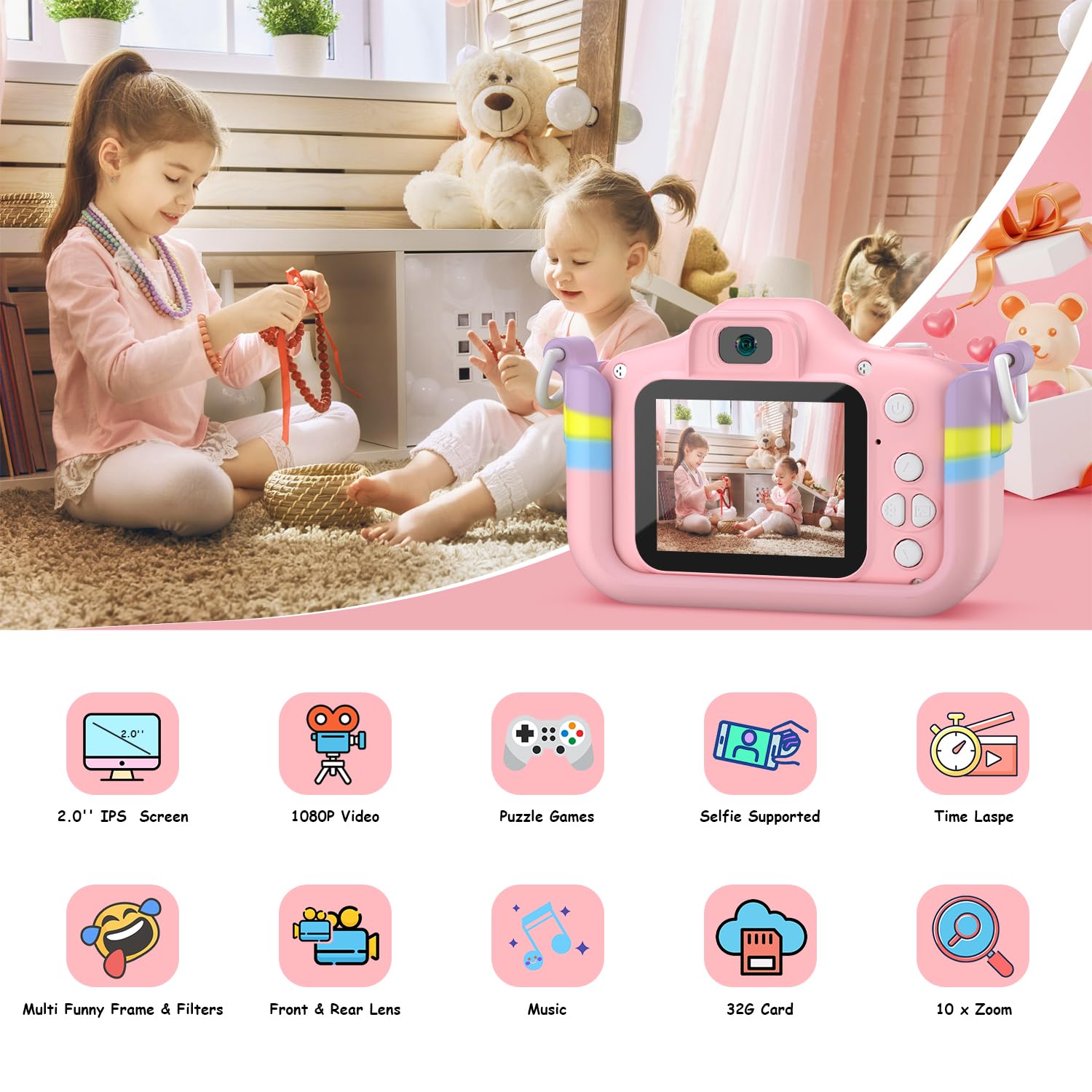 • Q: Is the kids camera durable and safe for toddlers? A: Yes, the kids camera is designed with durability in mind, using non-toxic and environmentally friendly materials. It includes a protective case and lanyard to prevent damage from drops, ensuring safety for toddlers.