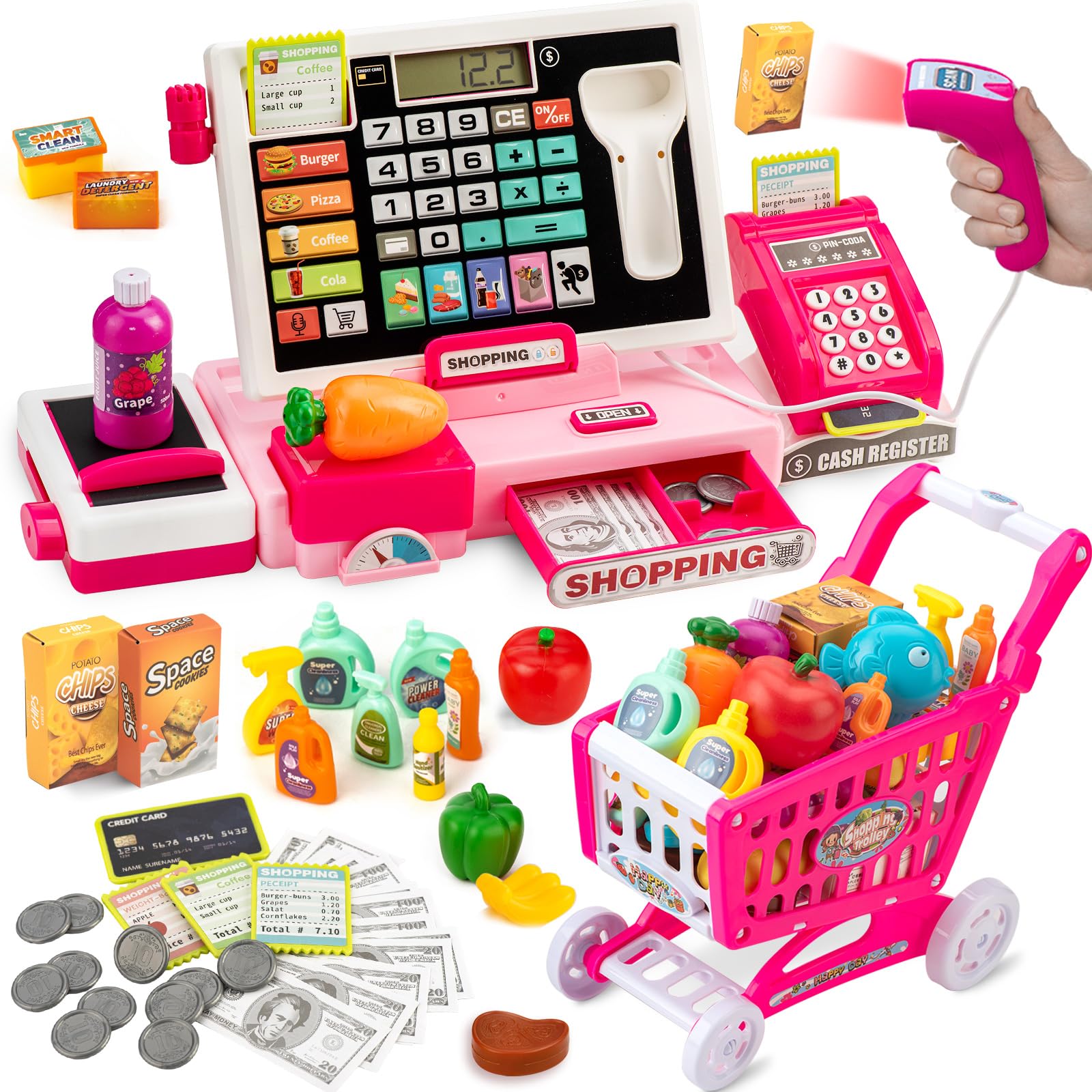 - Q: What accessories are included with the toy cash register? A: The playset comes with a variety of accessories including a microphone, credit cards, receipt slips, a scale, conveyor belts, POS machines, fake money and coins, along with play food, fruits, vegetables, drinks, and a shopping cart.