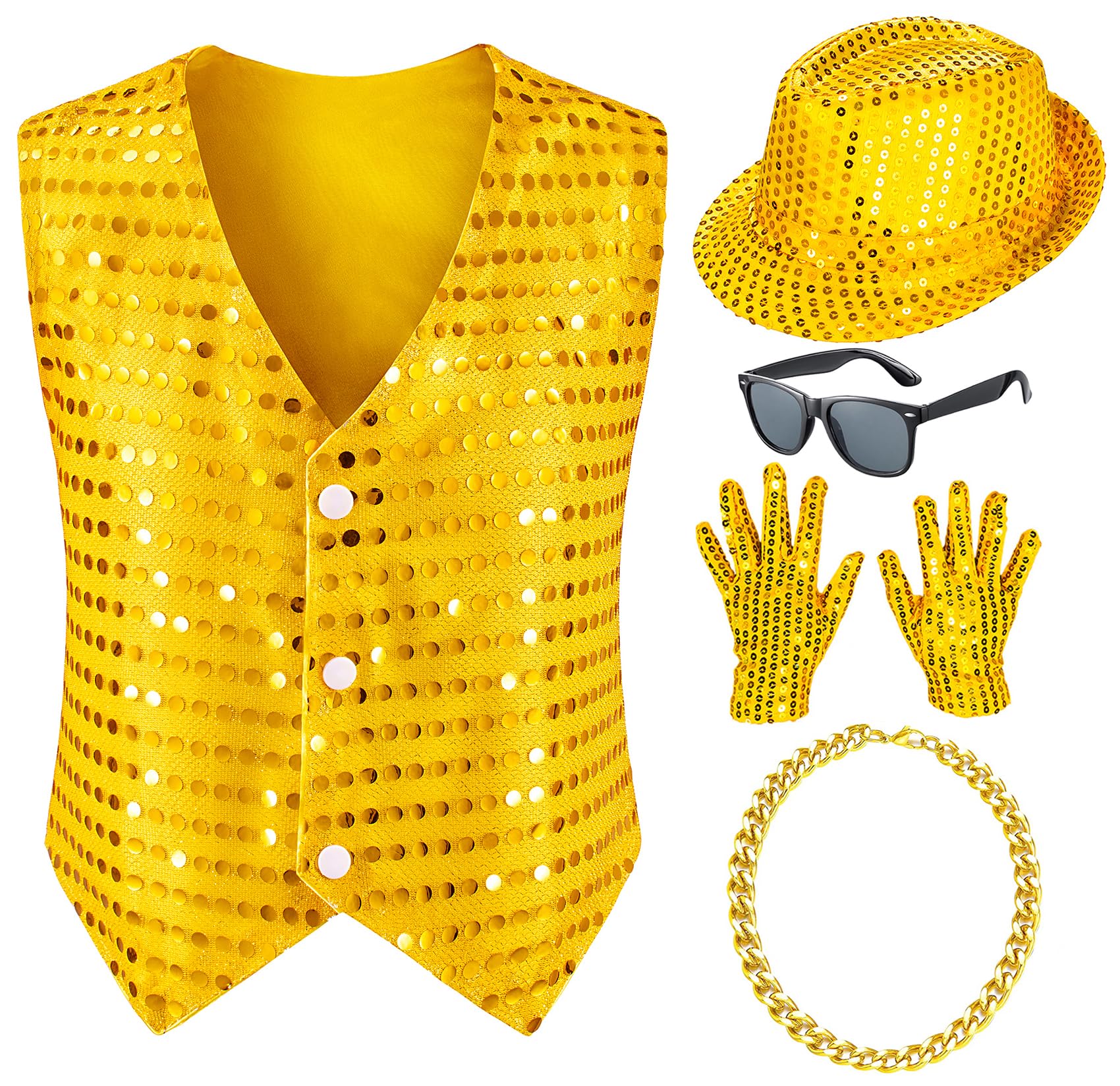 Packaging List:Vest ,Hat ,Sunglasses | Features: Shiny sequin vest and hat,Black glasses,cool dress up. | Size:3-4T; 5-6T; 7-8 Years; 8-9 Years; 9-10 Years;Please refer to the image for detailed dimensional data. | Medieval:Polyester+Glittery Sequin material. | Occasions: Perfect for Hip Hop, Jazz Dance, Street dance, role-playing, Dress up, Musical, school show, stage,school show, photo prop, Birthday, Festival dress-up, Halloween, Christmas cospaly, events, and everyday fun.