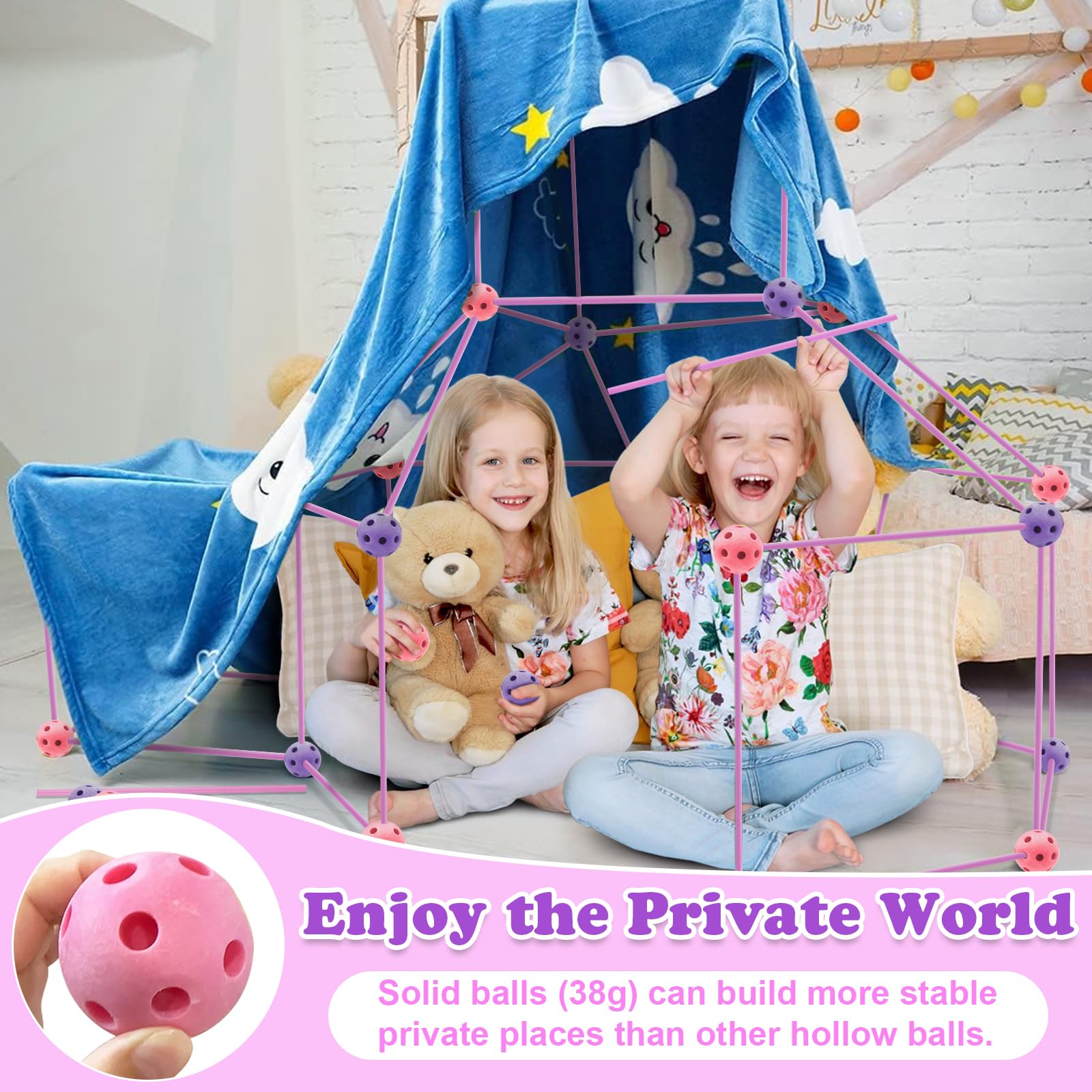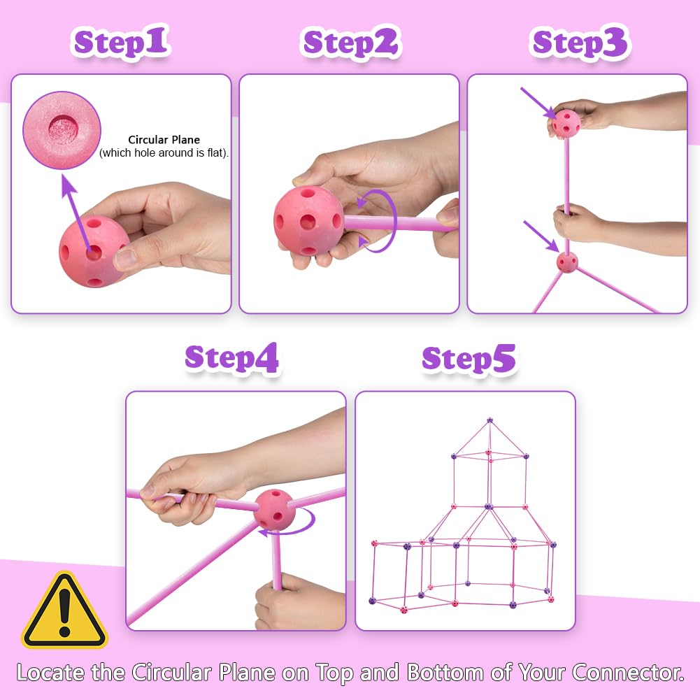 Obuby Kid's Construction Fort Kit is A Unique Building and Creative Toy!Ultimate Forts Builder Specifications: Types: Creative toys Material: Polypropylene (PP) Recommended age: 5+ Suits the crowd: Boys and Girls Sticks length: 14.96 in Balls diameter: 1.97 inKids Fort Building Kits Deluxe Set - 120 Pieces: 75 x Reinforced sticks 45 x Geometric balls (23 pcs purple/22 pcs pink) 1 x Instructions 1 x Portable Bag 1 x Color Gift Box Blanket not included.PRODUCT FEATURES & BENEFITS: Perfect a super fun STEM Making toy gifts for Boys and Girls all ages on birthday, holiday, christmas, halloween, new year. Not too big, not too small. It's the perfect size for indoor any living room, bedroom, den or outdoor with Portable Bag. Family or friends activities, to establish a better parent-child or friendship relationship, learn collaboration and cooperation. Simply insert and twist the rods into the balls, builder connect in a few seconds and easily disassemble, no worry about structural collapse. Endless build creativity and creations, DIY cave, play tent, rocket, house, igloo, princess castle, tunnel, teepee, tents, pirate ship and more. Fun and Exercises, Just add a bed sheet to create a hideaway Place to Play and Read, promote less screen time and encourage actual play.!!!CAUTIONS Keep away from fire. Damp wipe only and dry naturally. Not suitable for children under 36 months due to Small parts. DO NOT allow children to climb or stand on this product. Please always supervise your young child when playing.Make Every Customer Happy:Construction Fort Building for Kids: Obuby is committed to providing consumers with the best product and service, your SATISFACTION is the most important.