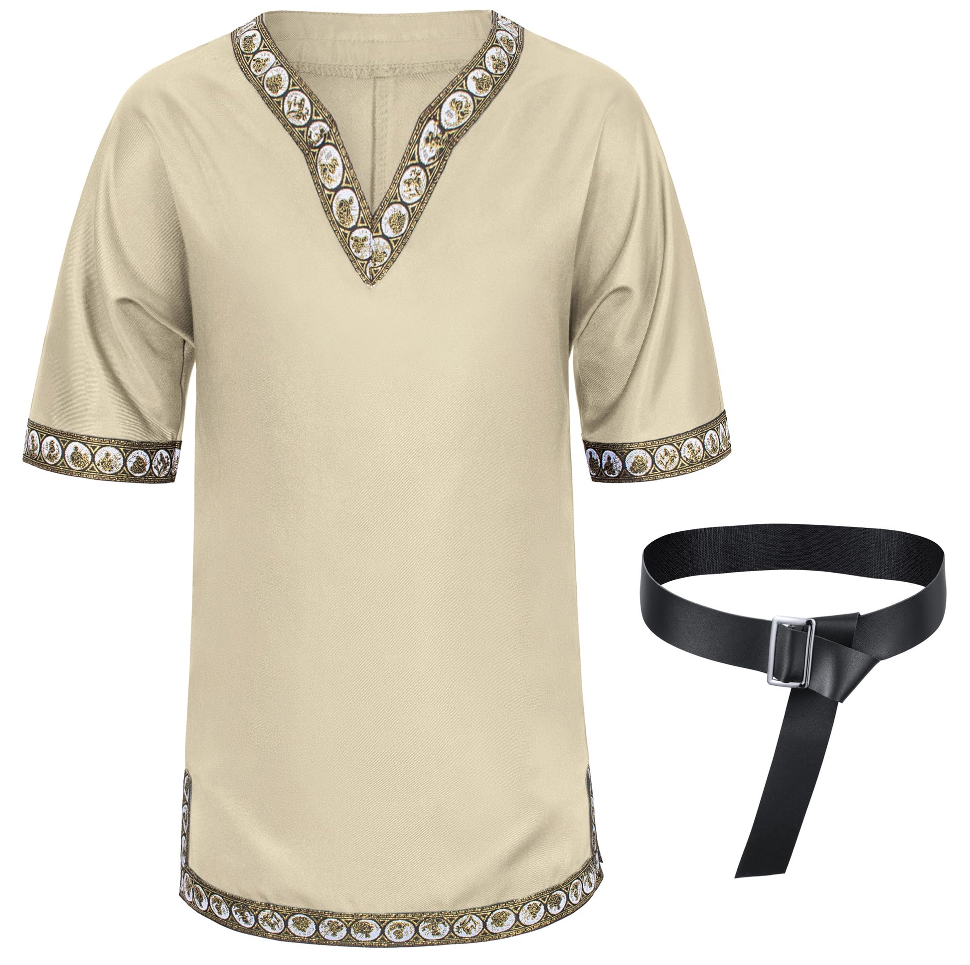 ?Package includes?:Tunic,Belt; | ?Material?: Made of high quality yarns, fabric, soft and comfortably fabric. | ?Features?:Medieval Tunic,V neck,Embroidered trim,Short sleeve,loose and breathable. | ?Size?:Suitable for most kids.Detailed size, refer to the Size Chart.Please choose the bigger size if you are overweight. | ?Application?:Suit for Medieval theme parties,Viking Role Play,LARP,Birthday,Halloween , Christmas cospaly, Carnival,Dress up, Easter,role-playing,school show, dance recital party,stage,school show, photo prop, events, and everyday fun.