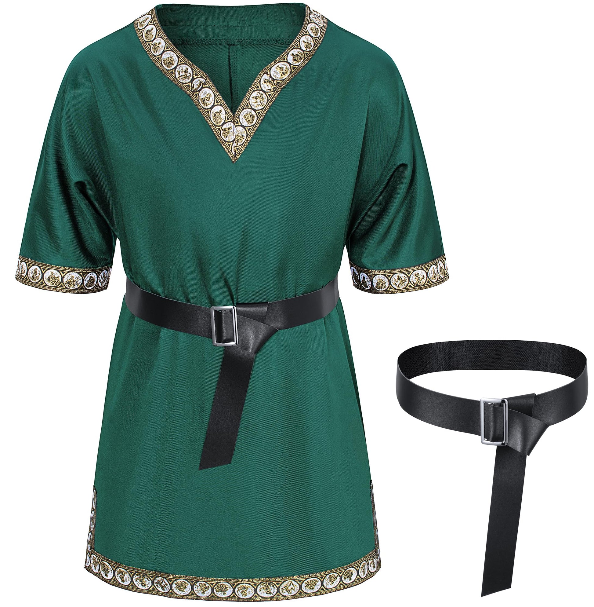 ?Package includes?:Tunic,Belt; | ?Material?: Made of high quality yarns, fabric, soft and comfortably fabric. | ?Features?:Medieval Tunic,V neck,Embroidered trim,Short sleeve,loose and breathable. | ?Size?:Suitable for most kids.Detailed size, refer to the picture.Please choose the bigger size if you are overweight. | ?Application?:Suit for Medieval theme parties,Viking Role Play,LARP,Birthday,Halloween , Christmas cospaly, Carnival,Dress up, Easter,role-playing,school show, dance recital party,stage,school show, photo prop, events, and everyday fun.