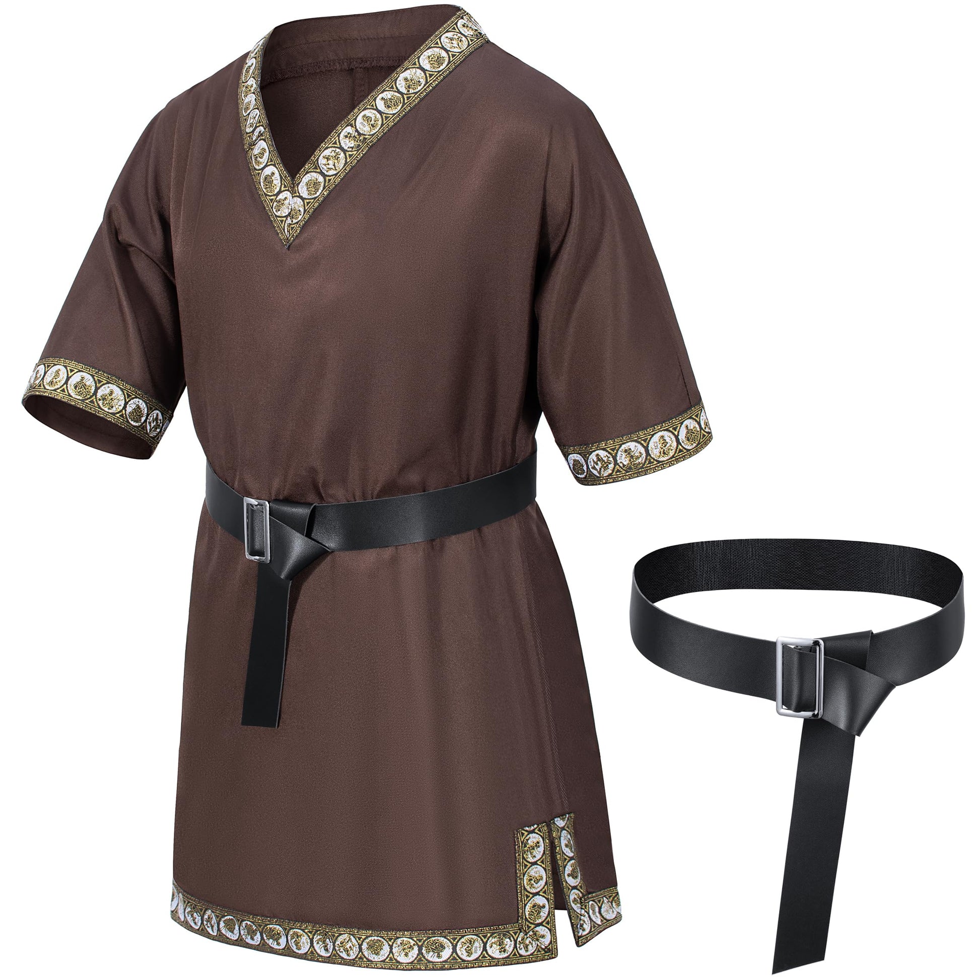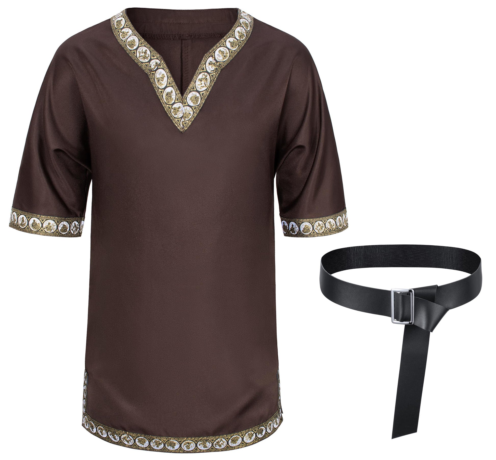 ?Package includes?:Tunic,Belt; | ?Material?: Made of high quality yarns, fabric, soft and comfortably fabric. | ?Features?:Medieval Tunic,V neck,Embroidered trim,Short sleeve,loose and breathable. | ?Size?:Suitable for most kids.Detailed size, refer to the Size Chart.Please choose the bigger size if you are overweight. | ?Application?:Suit for Medieval theme parties,Viking Role Play,LARP,Birthday,Halloween , Christmas cospaly, Carnival,Dress up, Easter,role-playing,school show, dance recital party,stage,school show, photo prop, events, and everyday fun.