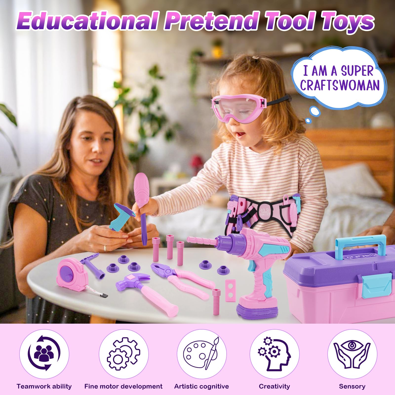 - Q: Can the electric drill actually function like a real drill? A: Yes, the electric toy drill in the set simulates real drilling actions with three interchangeable bits and sound effects, providing a fun and educational experience that helps develop fine motor skills.