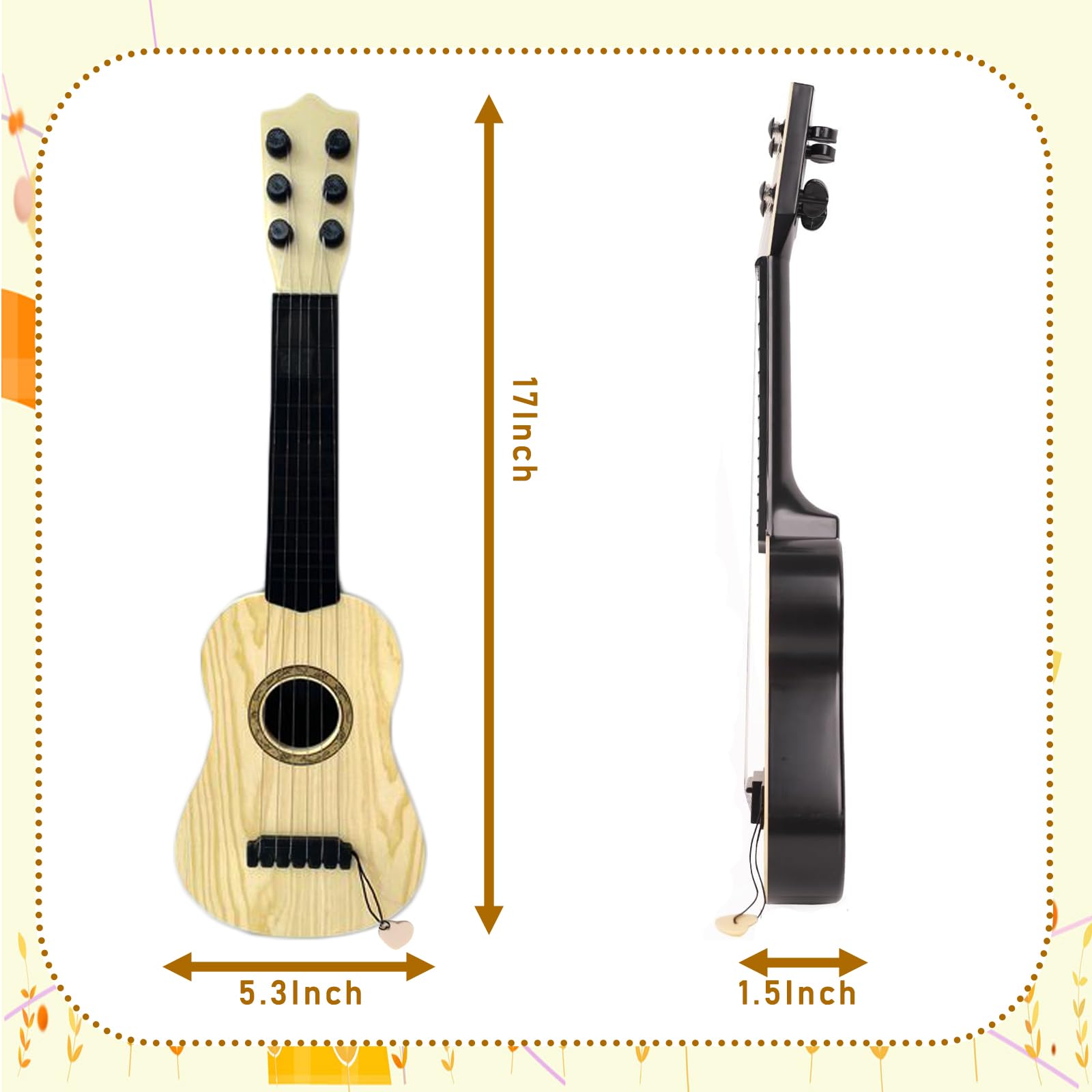 - Q: What are the dimensions of the Kids Toy Guitar? A: The Kids Toy Guitar measures 17 inches in length and 5.31 inches in width, making it lightweight and easy for children to hold and carry.