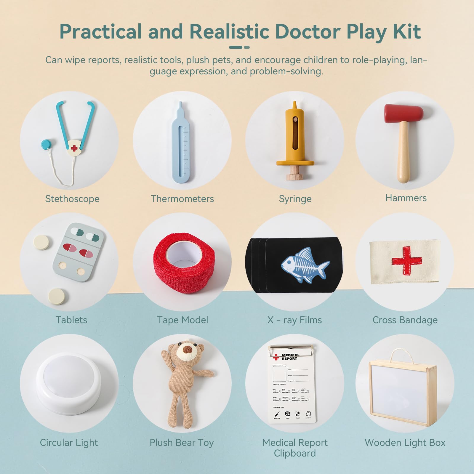 - Q: How does the X-ray lightbox work in the kit? A: The X-ray lightbox allows kids to place animal X-ray cards on it to diagnose injuries, turning learning into a fun game.
