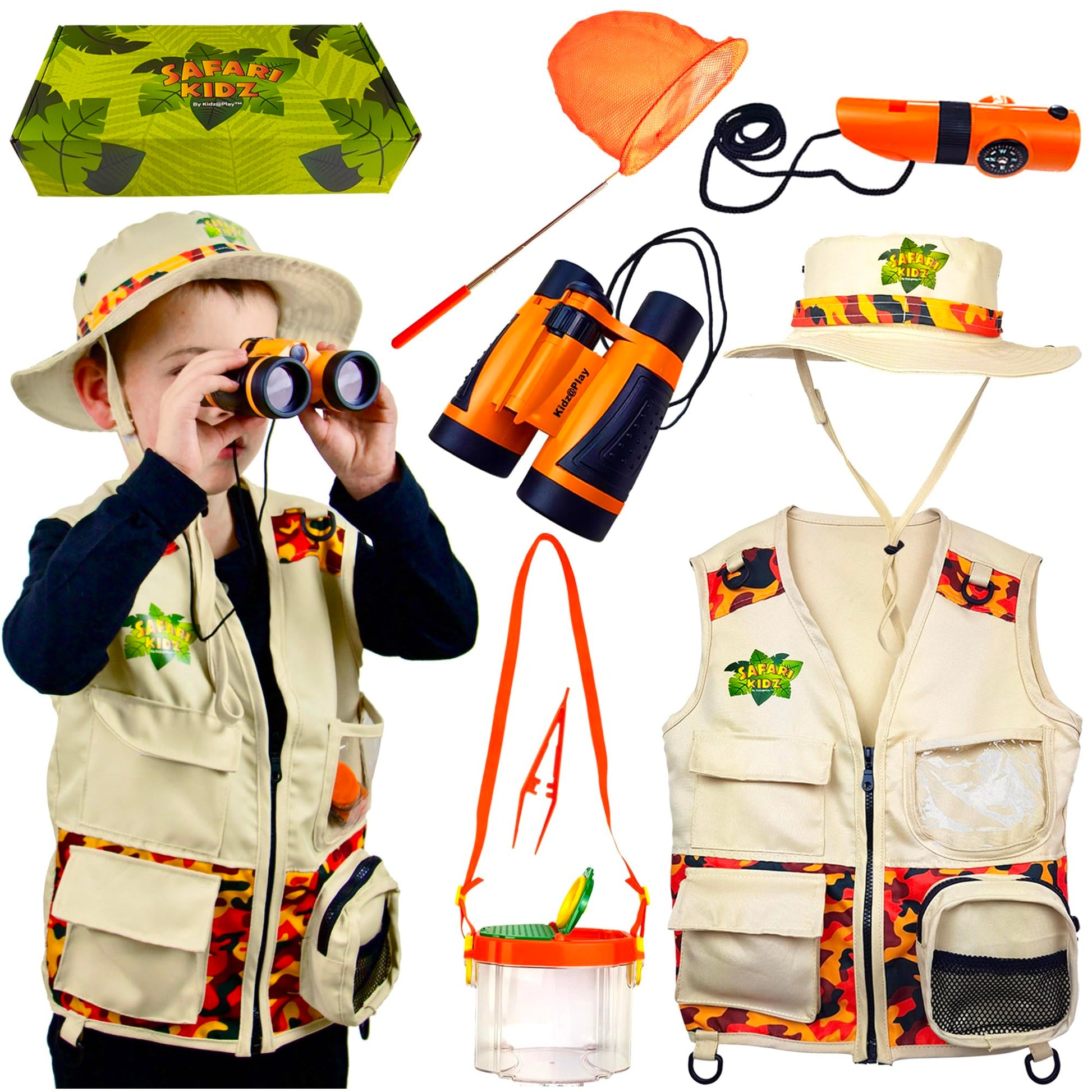 - Q: What items are included in the Kidz@Play Bug Hunting Kit? A: The kit includes a camouflage vest, hat, binoculars, a bug net, bug container, a 7-in-1 multi-tool (which features a flashlight, whistle, magnifying glass, and more), and tweezers, providing everything needed for outdoor exploration.
