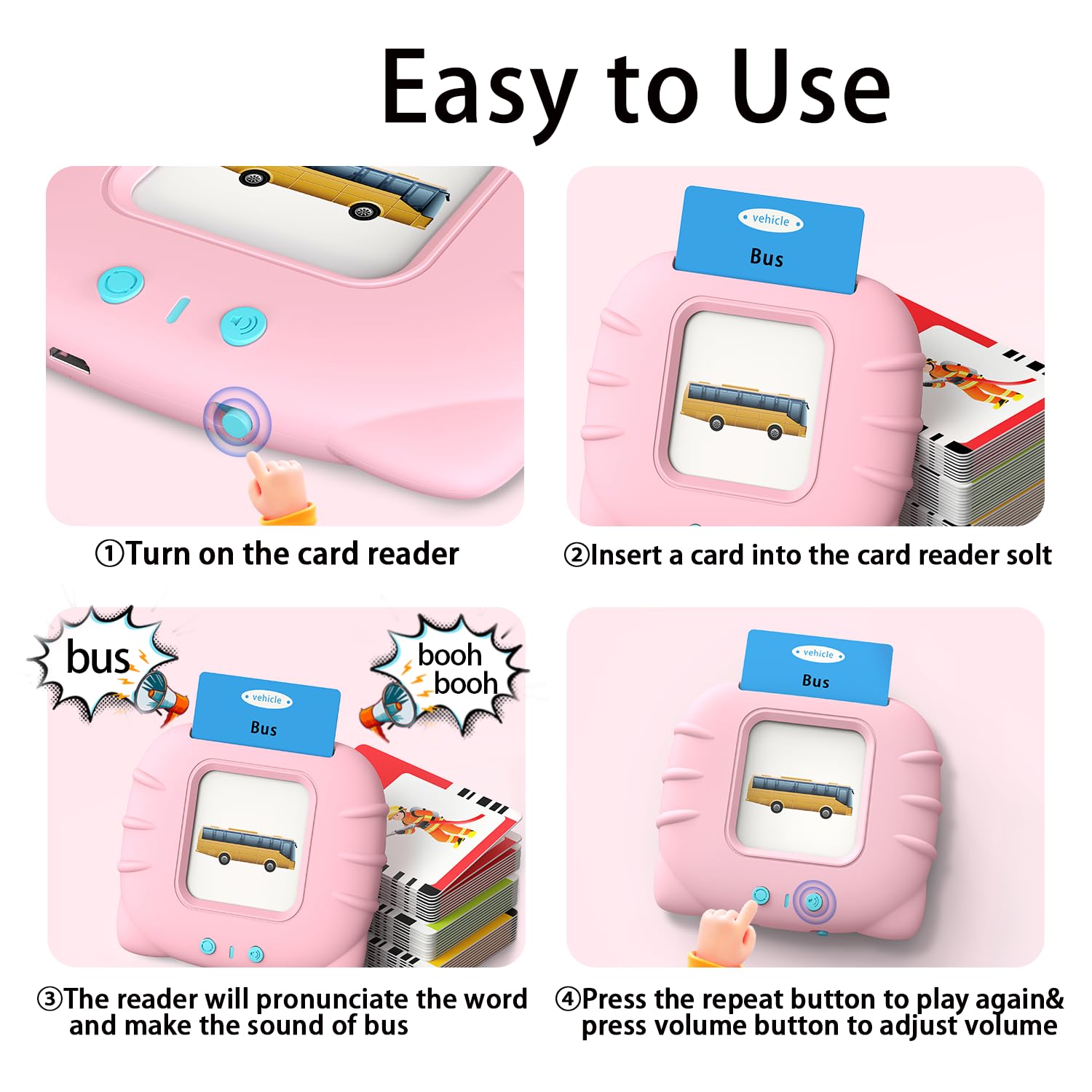 - Q: How do the talking flash cards work? A: To use the talking flash cards, simply turn on the card reader, insert the desired card into the slot, and the device will pronounce the word. You can also press the repeat button for repeated learning.