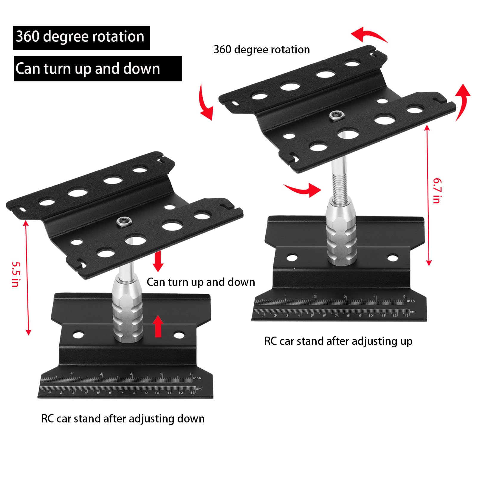 • Q: How adjustable is the height of the RC repair stand? A: The RC repair stand features an adjustable height that can be modified from 5.5 inches to 6.6 inches, allowing you to customize it to your preferred working height.