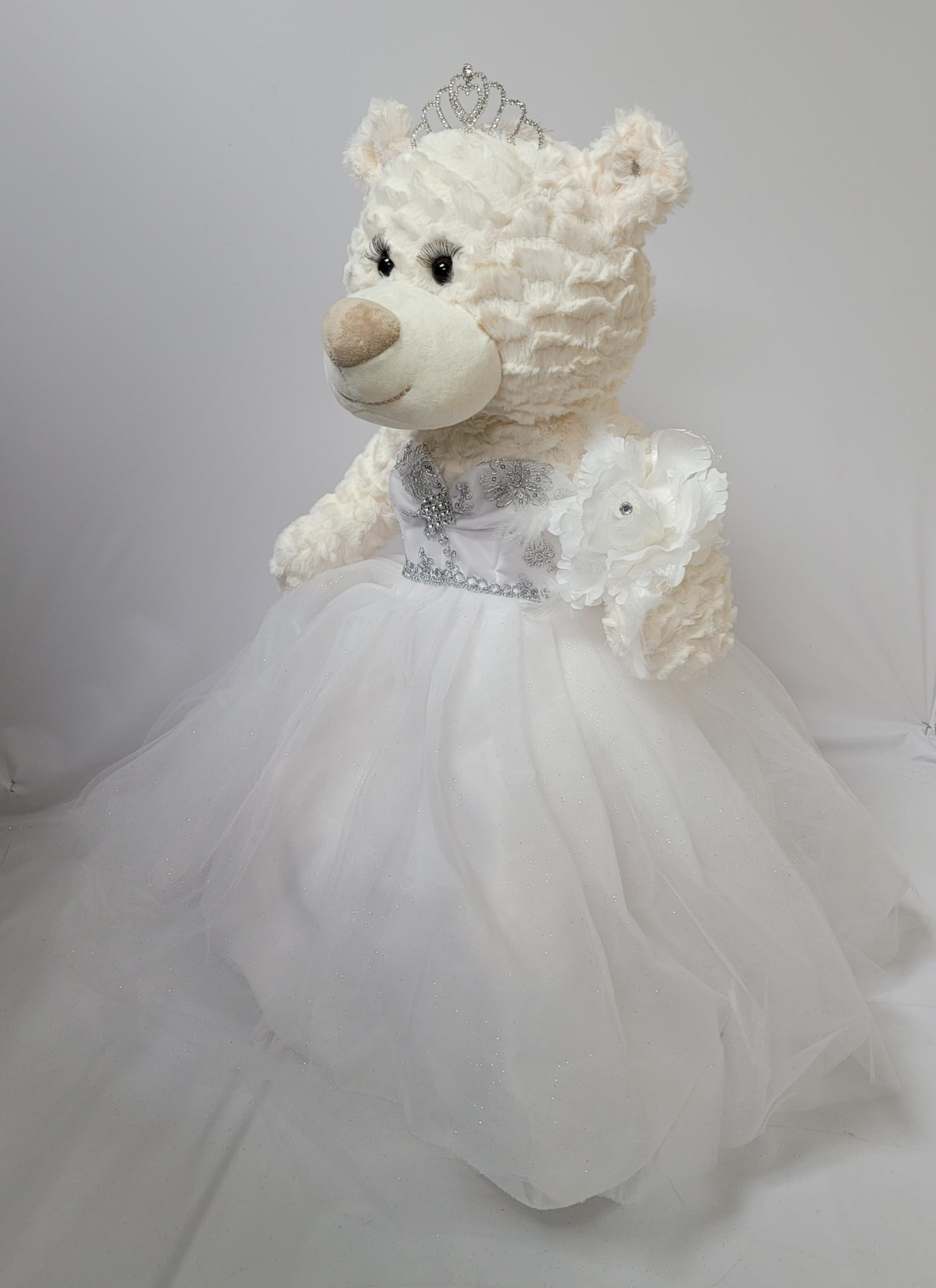 For those that are looking for something other than a doll... we now have the option of a Beautiful Elegant Bear Centerpiece. These bears measure 20'' long. Crme color, soft and cuddly, dressed in an elegant, glamorous gown. Unique with long curled lashes. The bust of the dress is decorated with sequins and the skirt is made up with multiple layers of tulle and satin. Complete and accessorized with a little rhinestone tiara, earrings, matching color wrist bouquet.