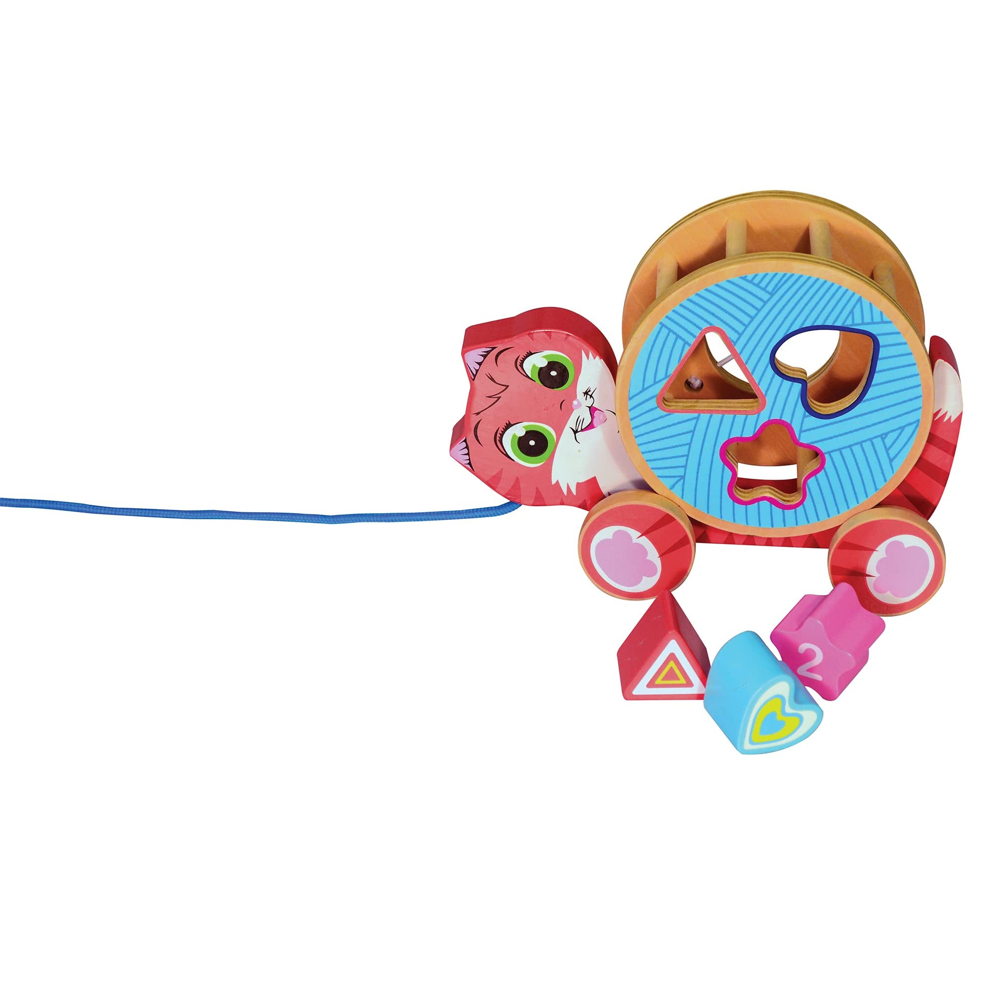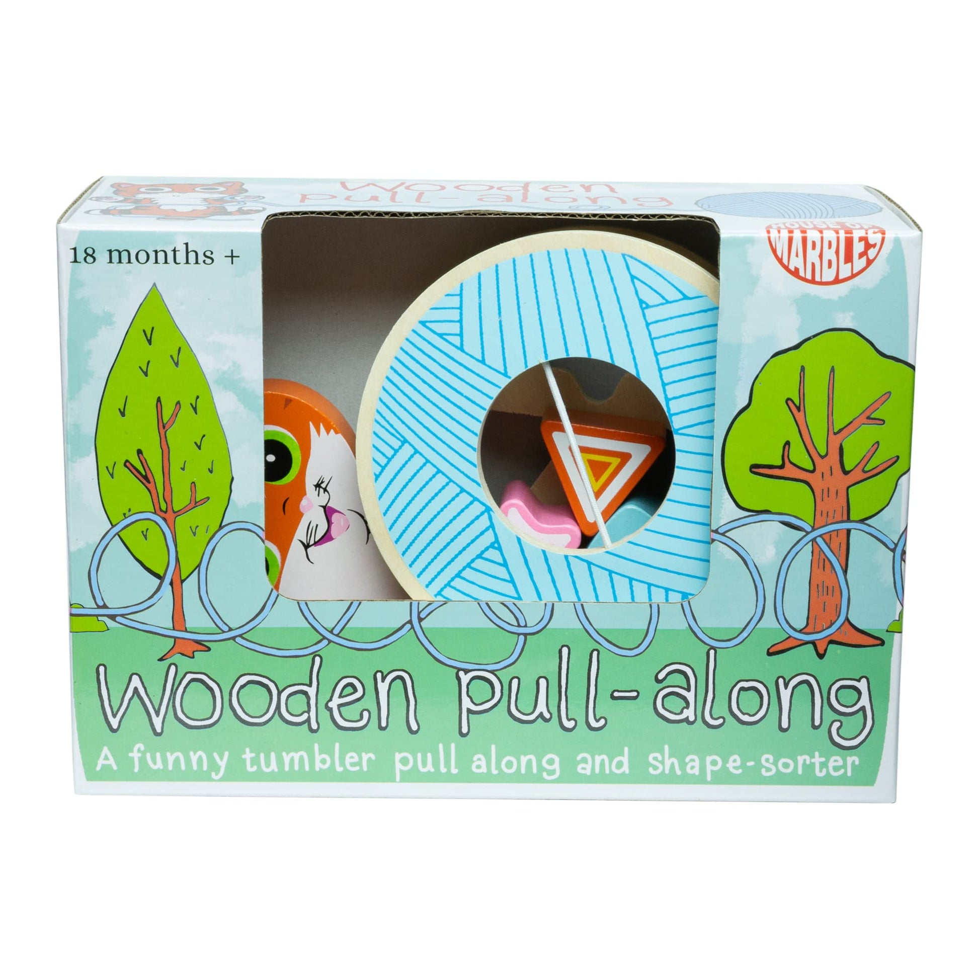 A cute kitten wooden tumbler in bright colours! This wooden tumbler is perfect for little hands to play with. This tumbler comes with a shape sorter which is perfect for children's development and has 3 different shaped wooden blocks with numbers on to push through and count while pulling the kitten along. Watch the shapes tumble about and see how your tot develops.