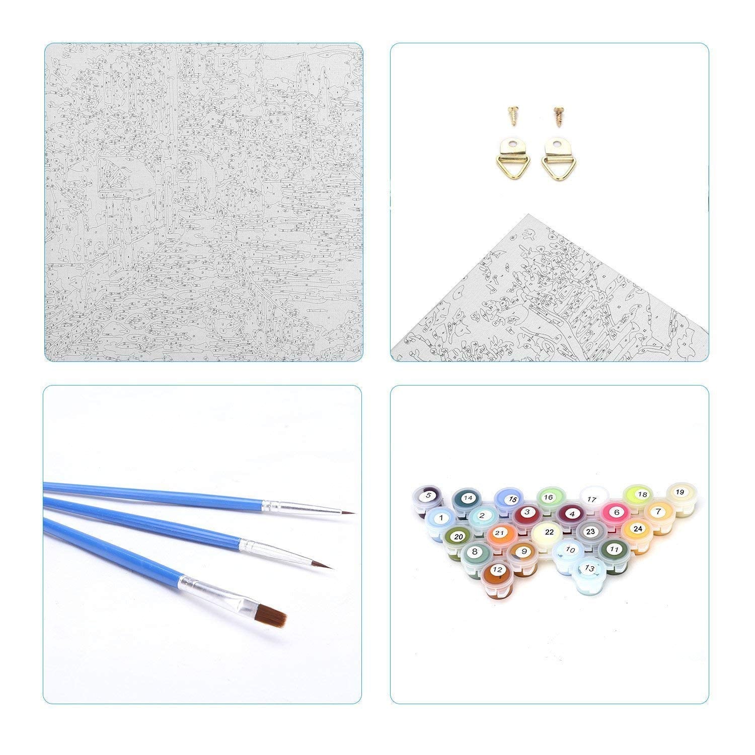 Product Feature: Paint by numbers for adults canvas painting unframed 16x20inch, diy paint by number kits provide fun way for anyone to get involved in the arts, great opportunity to unleash their creativity. | How to Do: You need match the paint number and the figures on the canvas to fill in the paint.You can be unique artist to create masterpieces by yours own way, while prmoting concertration and relieving stress. | Easy to Paint: Easy to follow the detailed instructions. All dots are marked by numbers, just chose one image follow your real heart. Perfect for adults and kids who is beginner level with patience. | Wide Aplication: Painting kits for Adults is perfect for home decoration as colorful pieces of art on your wall, also can be best gift choice for your friends or family. Engaged this fun project now! | Package Includes: Paint by number kits include gift box with 1 pcs pre-printed textured art canvas (without framed), 1 set acrylic paints, 1 set brushes(include 3pcs).