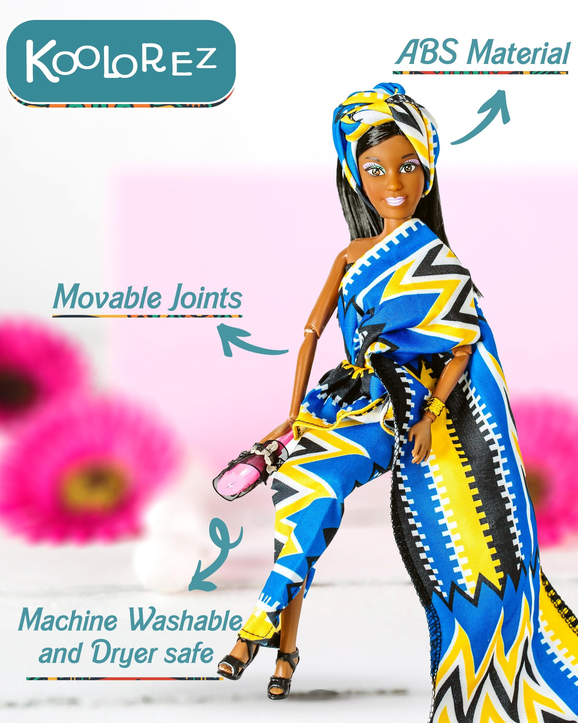 KOOLOREZ: Aisha - Our Queens Black Doll Set - Brown/Black Afro Doll w/Movable Joints - Lovely 12.5 Dark Skin & Diversity Dolls - Vinyl Dolls for Girls with African Heritage Style Outfit