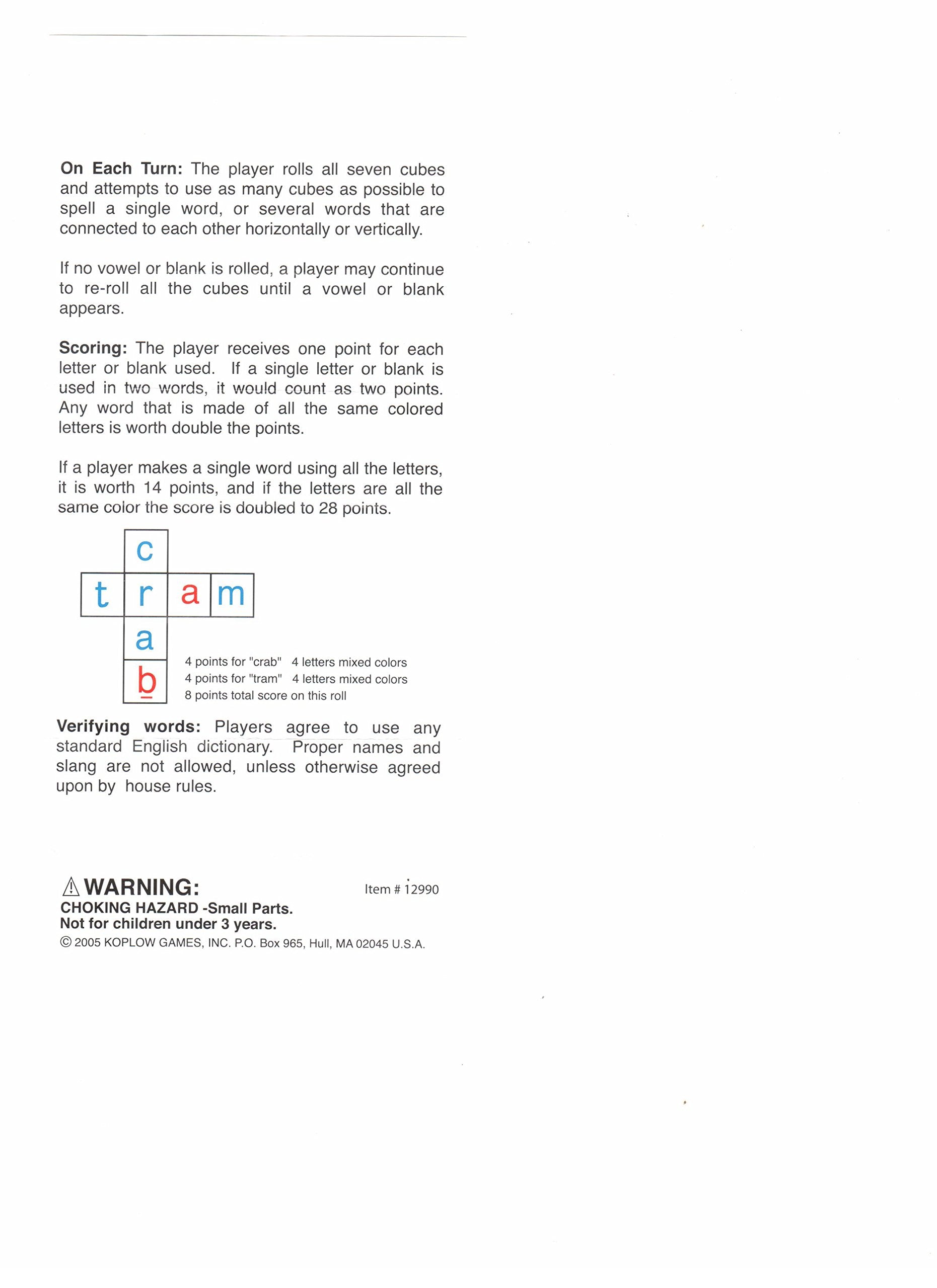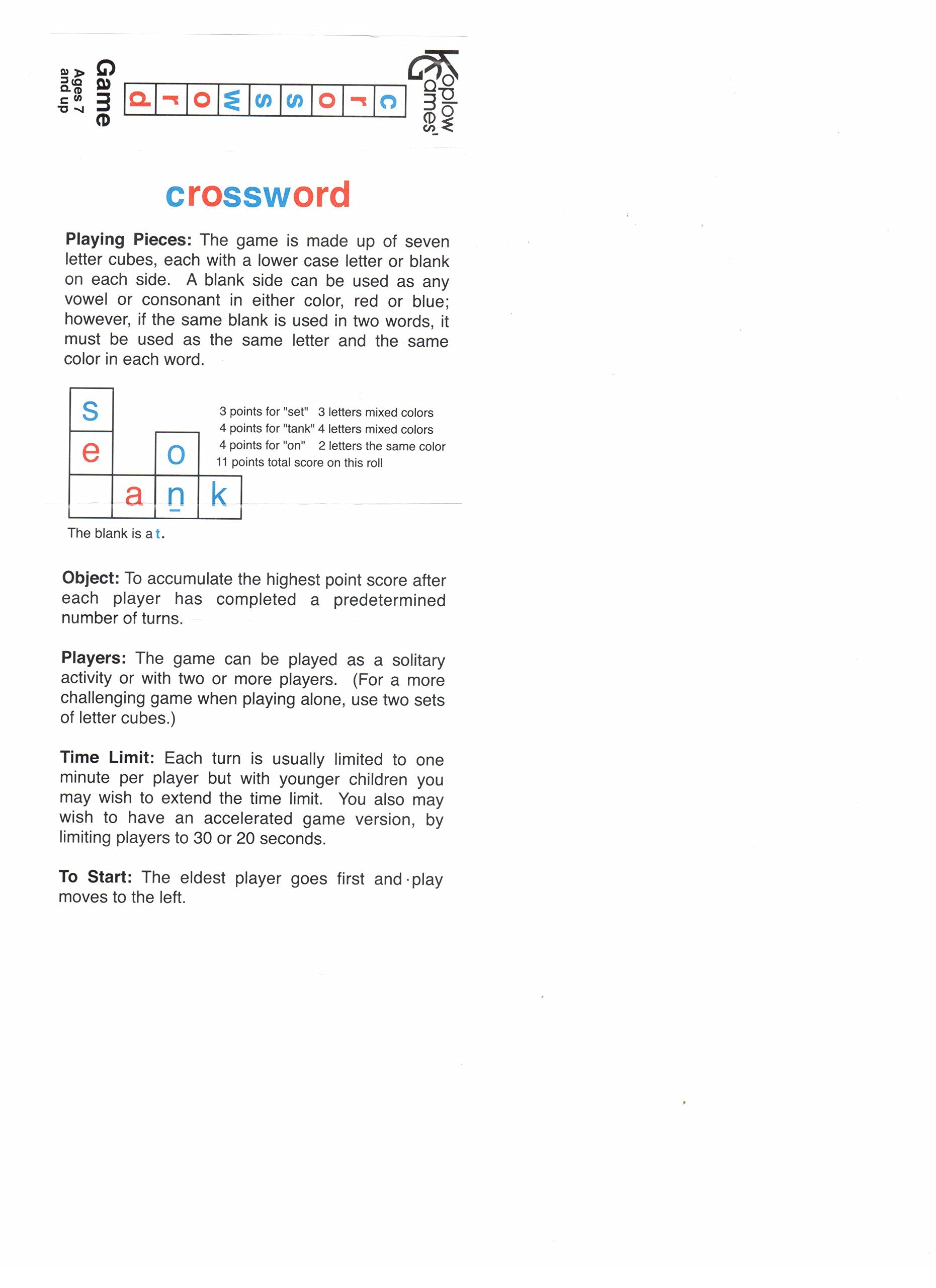 - Q: How do you play the Koplow Games Crossword Dice Game? A: To play, each player rolls seven letter cubes and attempts to create words to accumulate points. The game includes rules for scoring.