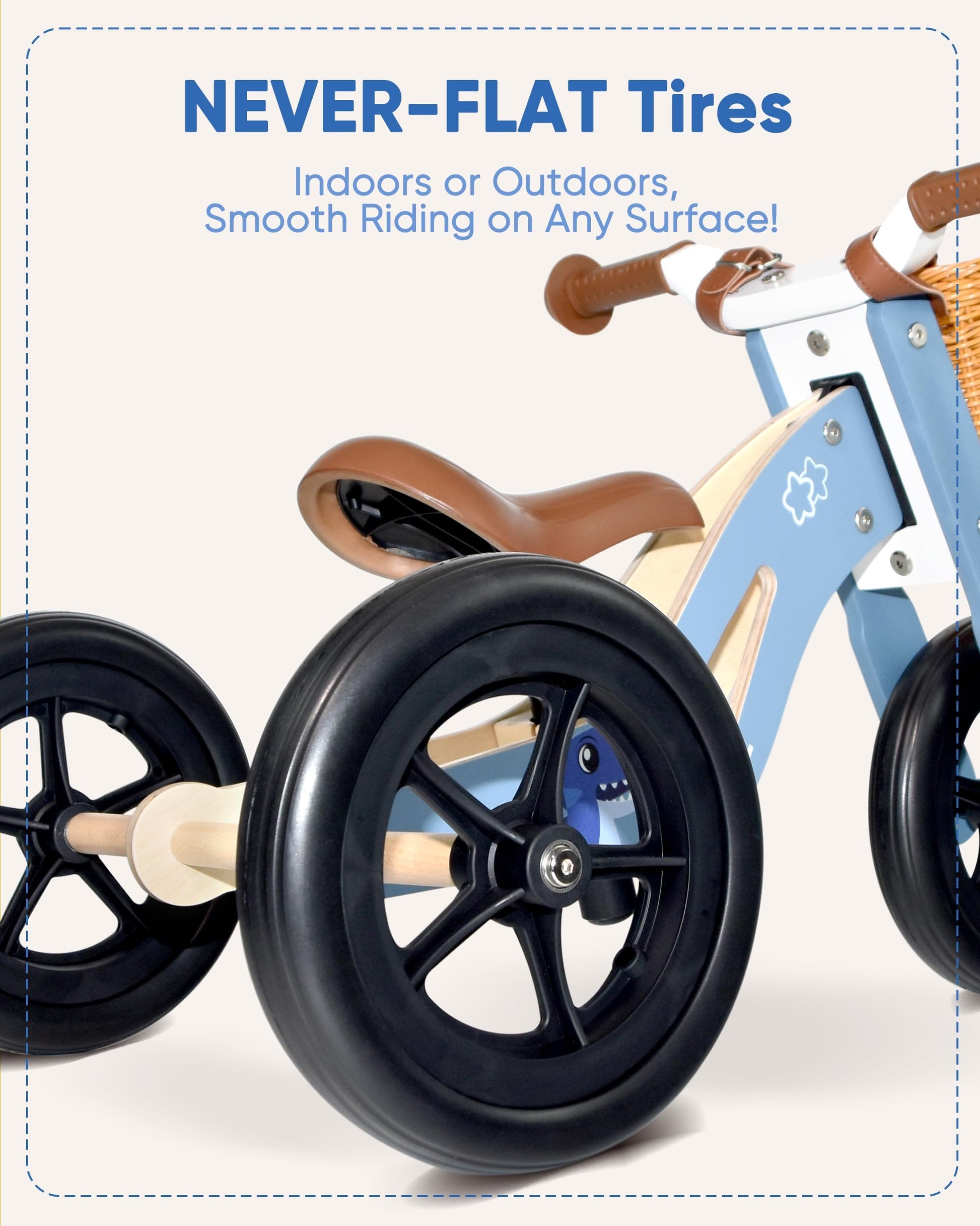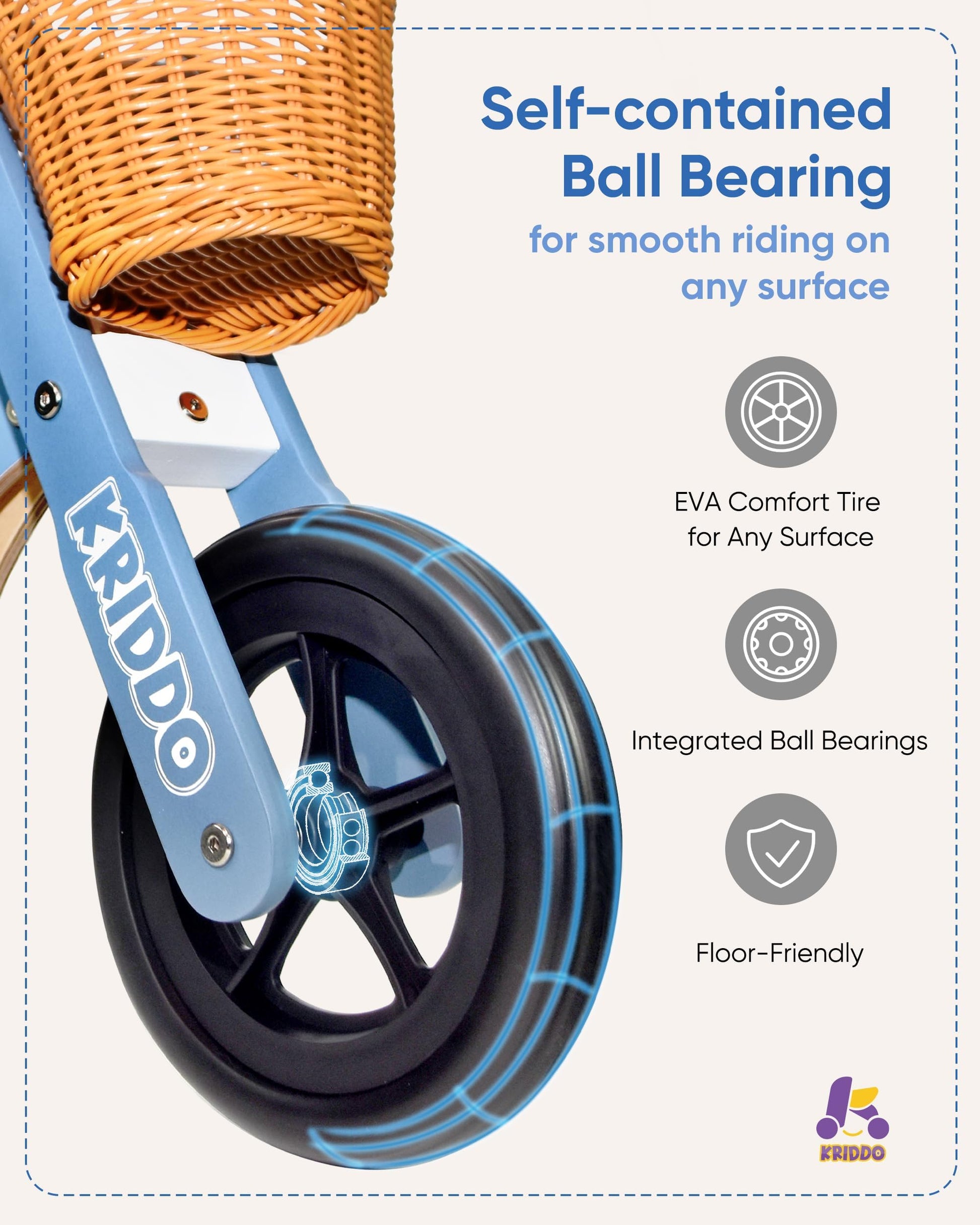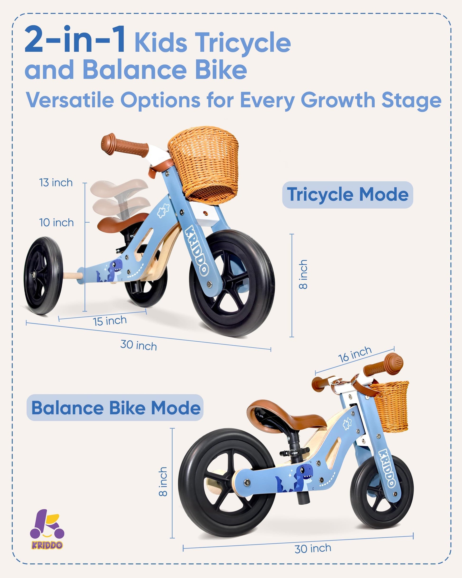KRIDDO 2 in 1 Wooden Kids Tricycle and Balance Bike with Pattern for 1-4 Years Old, No-Pedal Tricycle and Toddler Balance Bike with Basket and Adjustable Seat, Ideal for Outdoor and Indoor, Blue