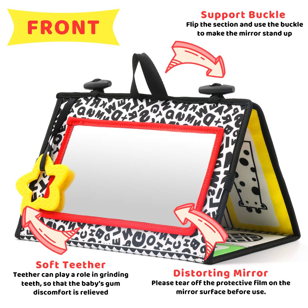 • Q: What are the benefits of using the KUANGO Tummy Time Mirror Toys for my baby? A: The KUANGO Tummy Time Mirror Toys are designed to promote brain development and strengthen muscles. The high-contrast black and white colors attract your baby's attention, encouraging visual stimulation and focusing skills. The baby-safe mirror and textured fabric engage infants, making tummy time enjoyable and effective.