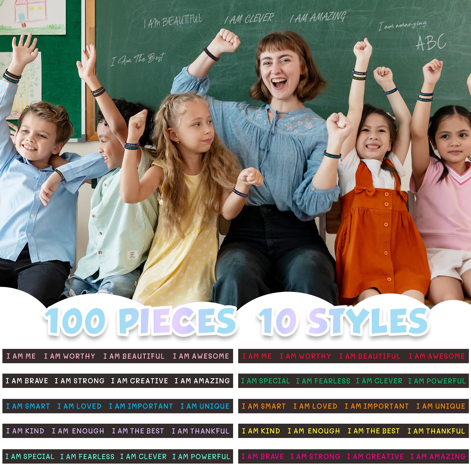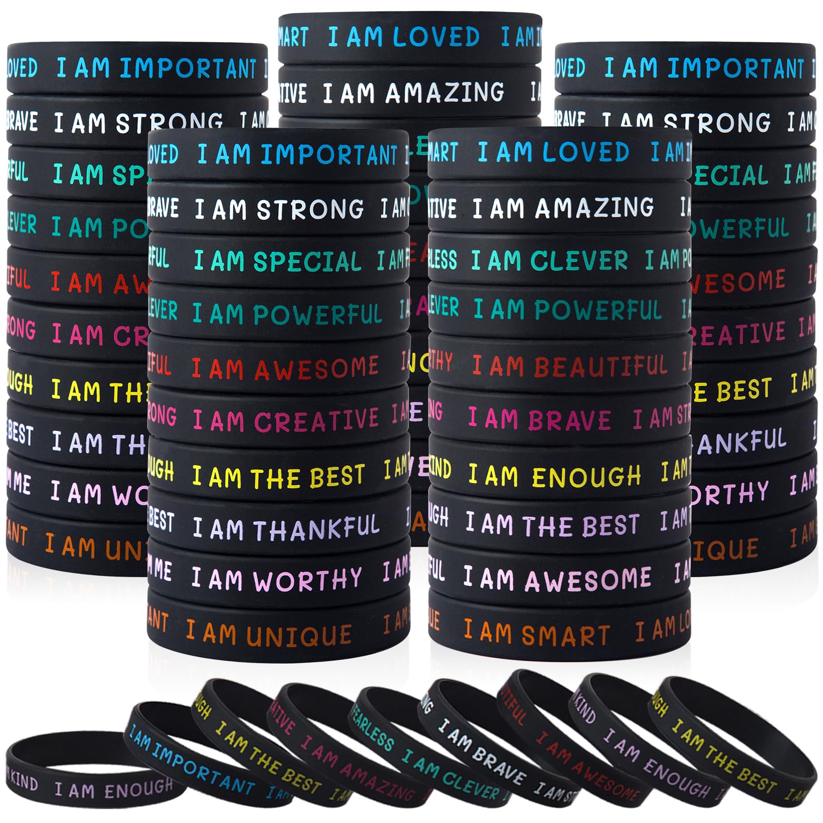 Abundant Quantity: there are 100 pieces of motivational bracelets, 10 styles and 10 pieces of each style.sufficient for your daily wear and replacement; You can share them with your classmates and friend. | Motivational Quotes Designs:I AM BEAUTIFUL,I AM WORTHY, I AM ME,I AM BRAVE,I AM AWESOME,I AM STRONG,I AM CREATIVE,I AM AMAZING,I AM SMART,I AM LOVED,I AM UNIQUE,I AM IMPORTANT and more show off your attitude and make you look cool and attractive! | High Silicone Material: The inspirational rubber bracelet is made of silicone material, soft and comfortable, 2.3 inch in diameter and 0.5 inch wide, suitable for children and teens. | Wide Application: Inspirational silicone wristbands can be used as birthday gifts, holiday gifts, party favors, student games, class awards, carnivals and other occasions. The bracelets are colorful and keep a good positive and optimistic mindset every day. | Sending Your Love: the silicone wristbands are inspirational presents for your kids, friends, daughters, nieces, neighbors and classmates on birthday, graduation, first day of school, important festivals and big event celebrations, presenting your sincere blessings of keeping active attitudes.