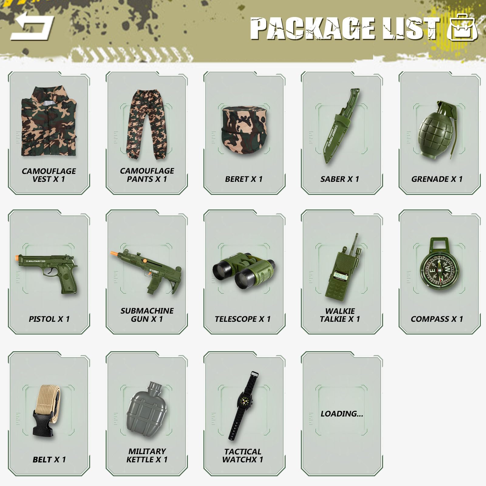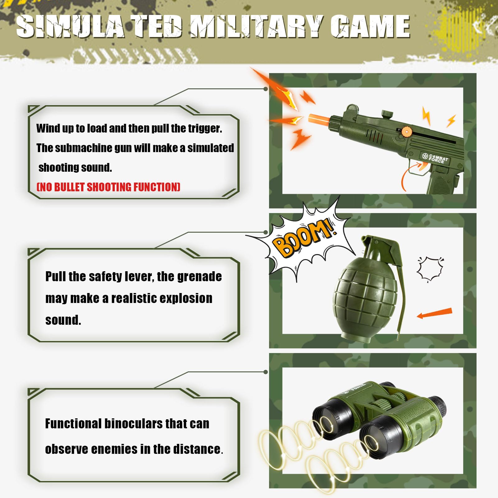- Q: What features make this costume realistic for pretend play? A: The costume includes a deluxe weapon set that produces authentic sounds, along with carefully designed accessories, providing a realistic experience of being a soldier.