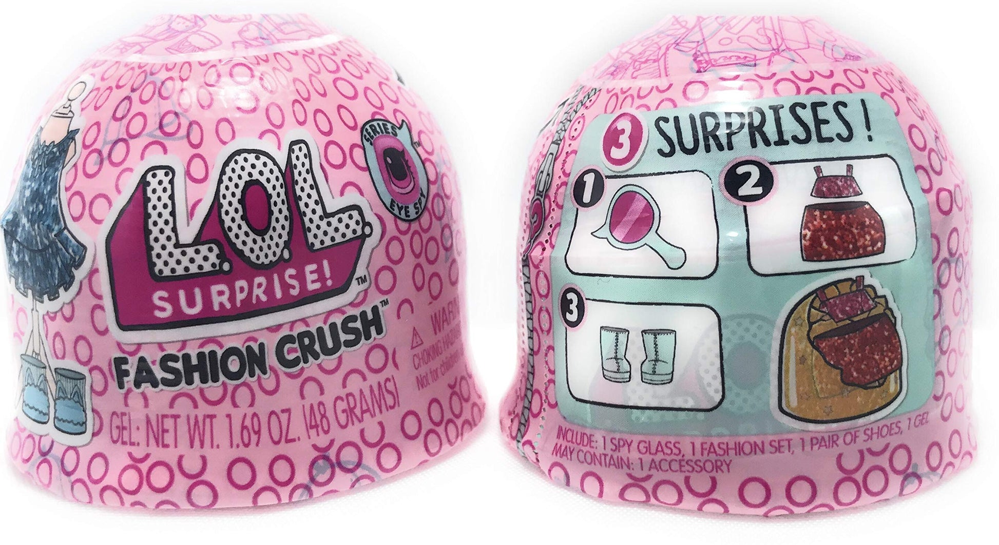 SummaryUnbox 3 fashionable surprises with each L.O.L. Surprise! Eye Spy Series Fashion Crush.Unbox the spy glass to find codes and unlock surprises. Crush the glitter jelly to unbox outfits and shoes. Mix n match fashions and shoes to accessorize L.O.L. Surprise! Dolls with endless wardrobe combinations.Collect them all!Images, colors, accessories and decorations subject to change.Product DetailsSeries: L.O.L Surprise Dimensions: 2 x 2 x 2 Country of Origin: Hong Kong