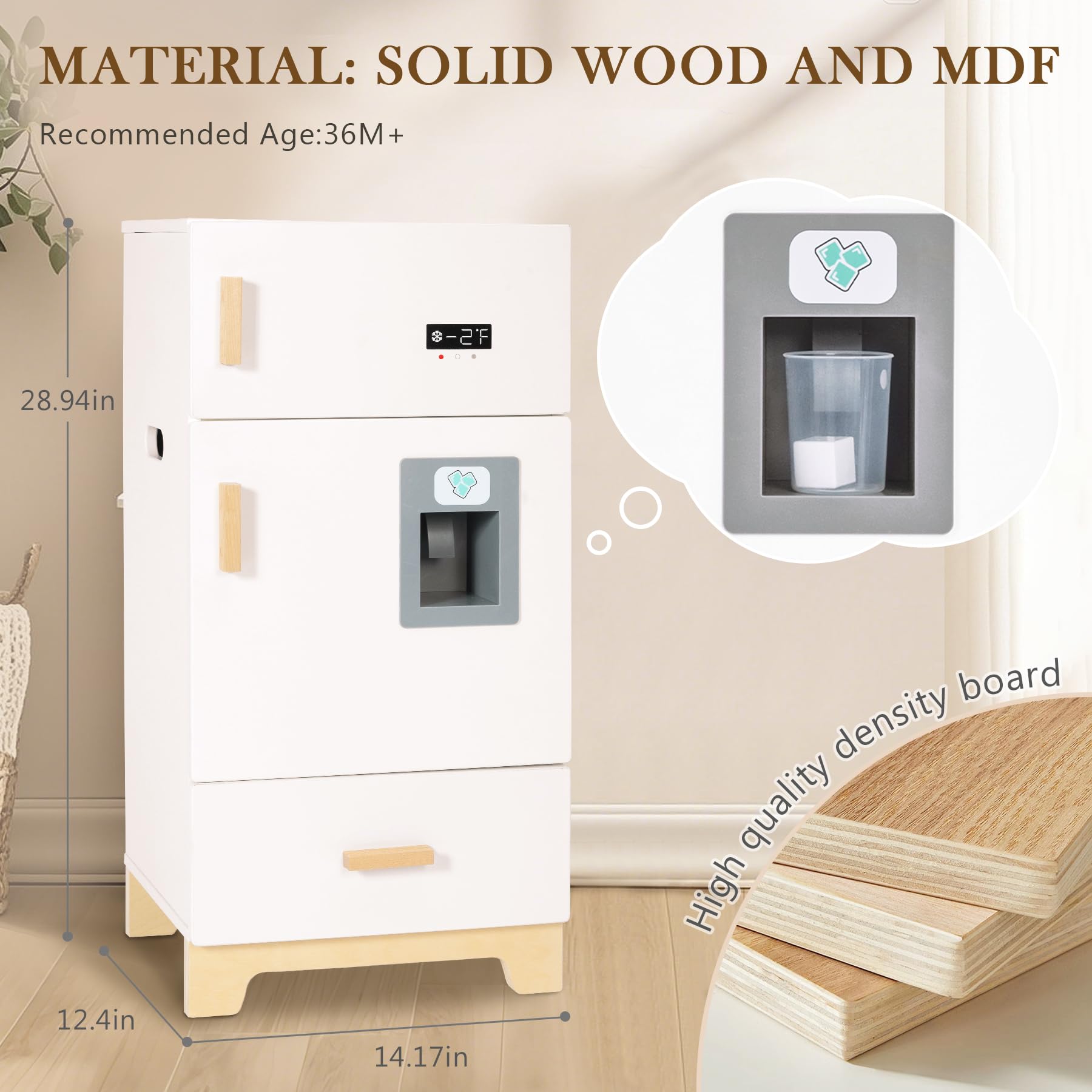 Distinctive Details: double door cabinet-style refrigerator with bottom drawer. Large storage space, built-in ice dispenser, waist high switch, temperature display screen, wooden ice cubes and back fixing to the wall device. | Real function: built-in ice dispenser are safe material for children, and the wooden cubes can be released to the bottom floor, and kid can Shovel ice cubes from the refrigerator. It's really a realistic role play! | Educational toy: Let children experience the fun of being a chef and little master at home, and cultivate practical skills and interest in housework. Promote children's brain and body development at the same time. | Right Size for Baby: This wooden fridge height is 27 inches (68.5 cm), a suitable size for baby 1-3 years old. They can access it, open and close doors, shovel ice, etc. without the help of adults. | Certification Materials: All the Materials are strict to the Toys Safety Standards ASTM/CE in USA and EN71 CE in Europa. Easy assembly and easy clean.