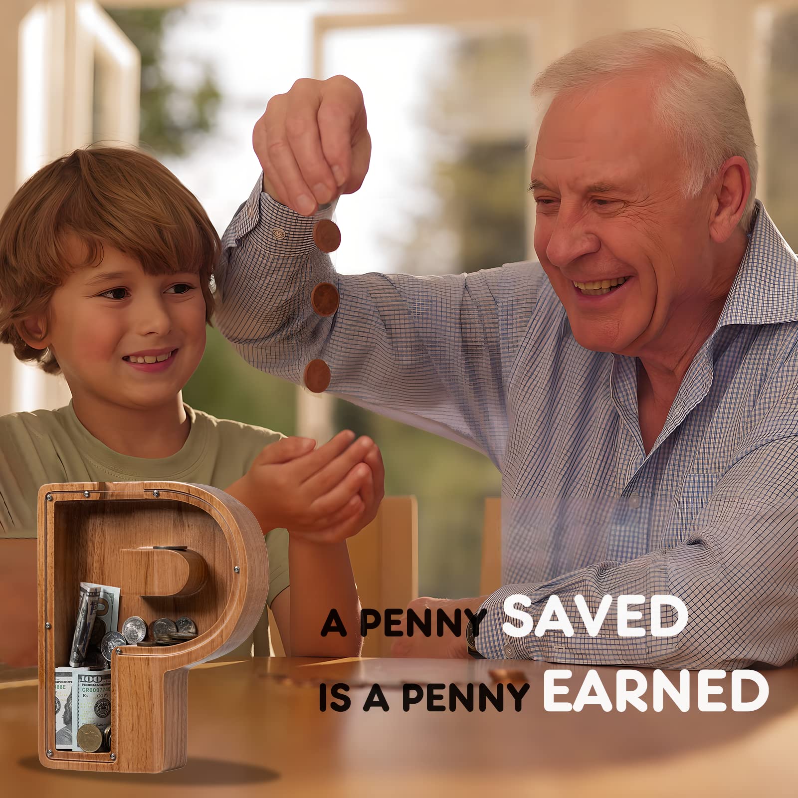 Ladenk 12 Inch Extra Large Wooden Kids Letter Piggy Bank - Piggy Bank For Boys Girls - Initial P Bank - Alphabet Money Bank For