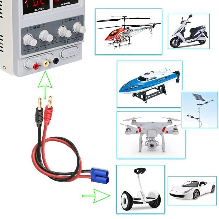 Product Description EC5 connector to 4.0 Banana Plug Charging Cable 12AWG 30cm(11.8 inch) for RC Helicopter Vehicle Toys,Quadcopter Car Specifications: Voltage: 70V DC Connector 1: Male 4mm Banana Plug Connector 2: Male EC5 Connector Wire Type: 12AWG silicone and copper Length: 30CM/11.8 inch Application: Can be used for RC Helicopter Vehicle Toys,Quadcopter Car and other RC chargers. Package includes: EC5 Plug Connector to 4mm Banana Plug adapter with 12AWG cable (2 pack) NOTE: 1. Kindly contact us freely if there is any question or needs, you may apply for refund if there is quality problem with product. 2. Kindly choose a matching connector plug adapter, otherwise the device may not be used or the device may be damaged. 3. Welcome to visit our store to get more models of 4mm banana plug products.