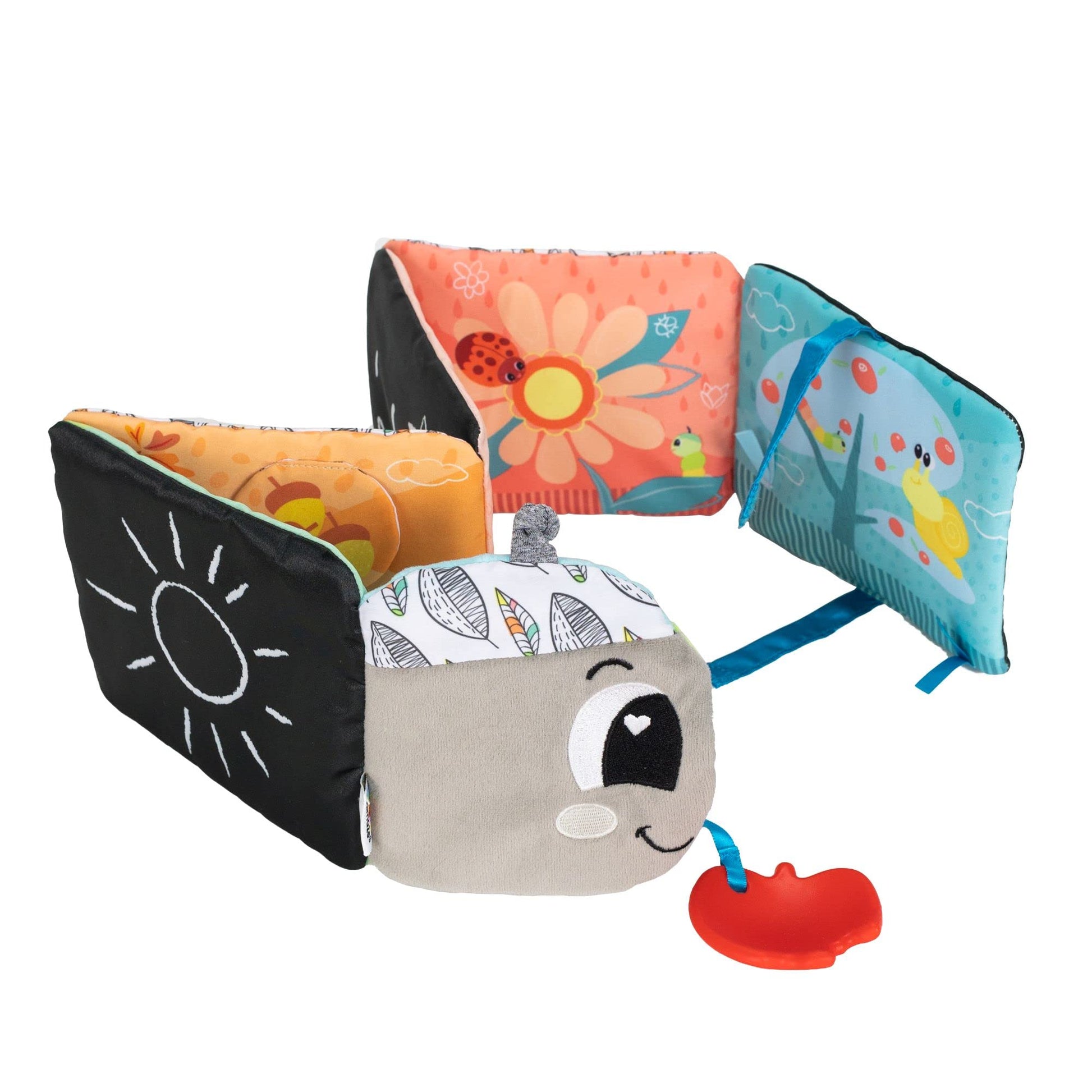 Embark on a sensory adventure with this adorable Lamaze Colorful Caterpillar Journey soft book! This baby crinkle toy will keep your little one entertained and happy as you read together and enjoy precious bonding time. This baby book features two unique sides to explore; on one side, each accordion panel is bursting with bright colors, playful images, and exciting things to explore – like a hidden squeaker, unique fabric textures, and delightful crinkle sounds. Flip to the other side to find calming, black-and-white patterns that delight younger babies as they learn shapes and patterns. There’s even an apple tethered to the front that is perfect for chewing when your baby needs a little teething relief. This baby soft book folds up so that it is easy for the family to take along on the go. The Lamaze Colorful Journey Caterpillar book makes a sweet addition to a gift for a baby shower party or a fun gift for baby’s first birthday. Give your little ones the gift of learning and early discovery!