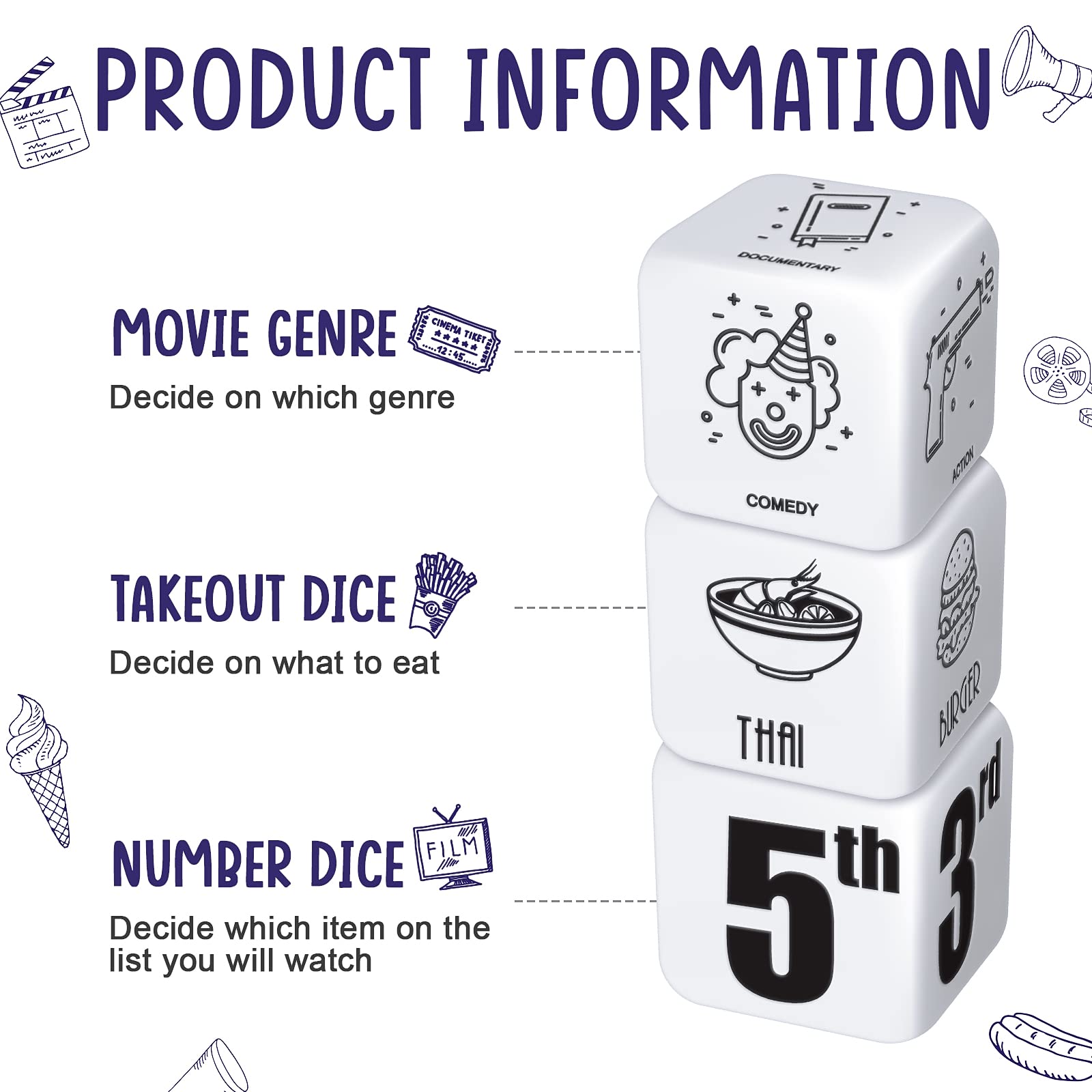 - Q: How do I use the decision dice for date night? A: To use the decision dice, simply roll the three dice: one for food options, another for movie genres, and the last for choosing which specific item to watch. This adds a fun and spontaneous element to your date night.
