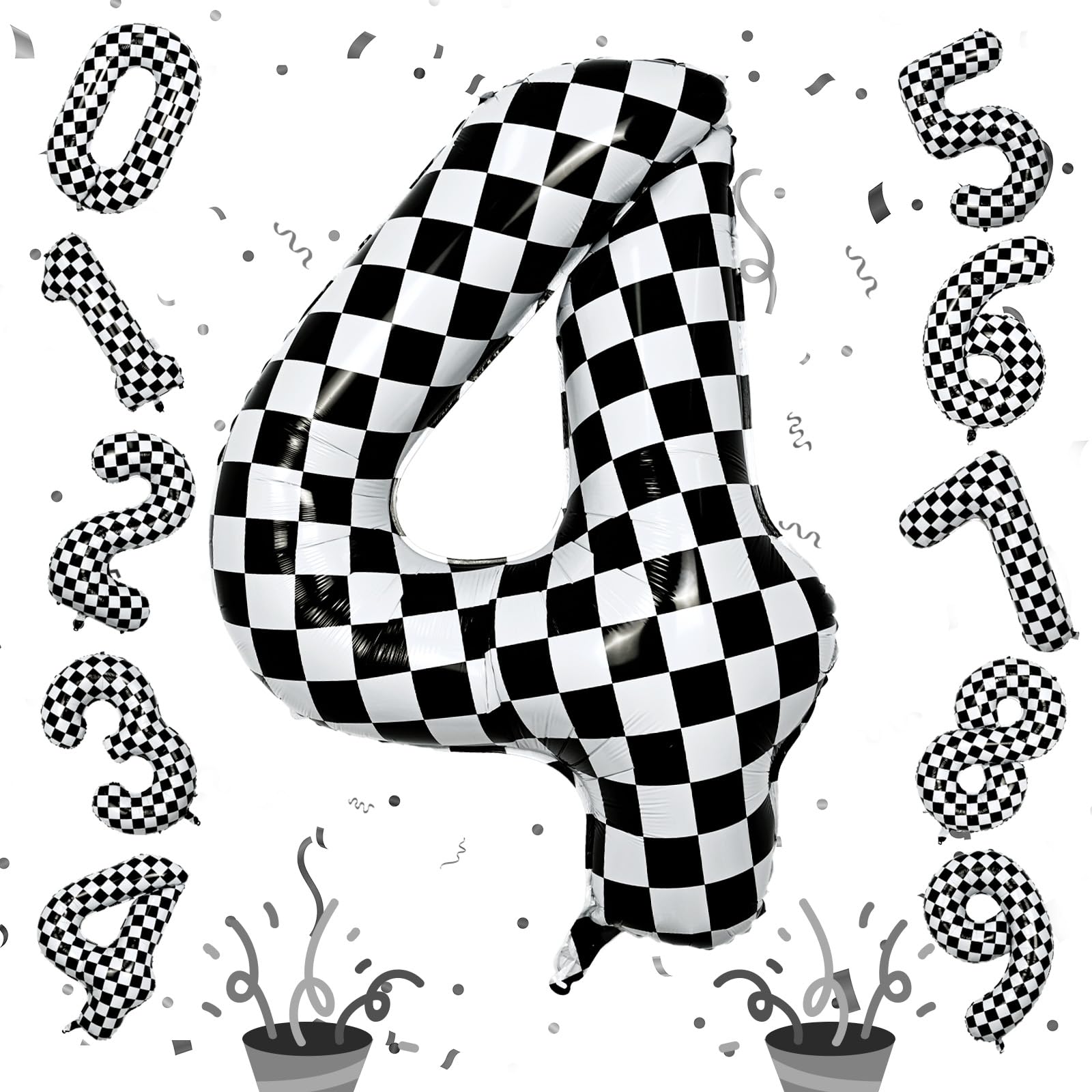 Large Foil Number 4 Balloons, 40 Inch Black And White Checkered 4 Balloon For Boys, Helium Self Inflating Checkered Racing 4 Bal