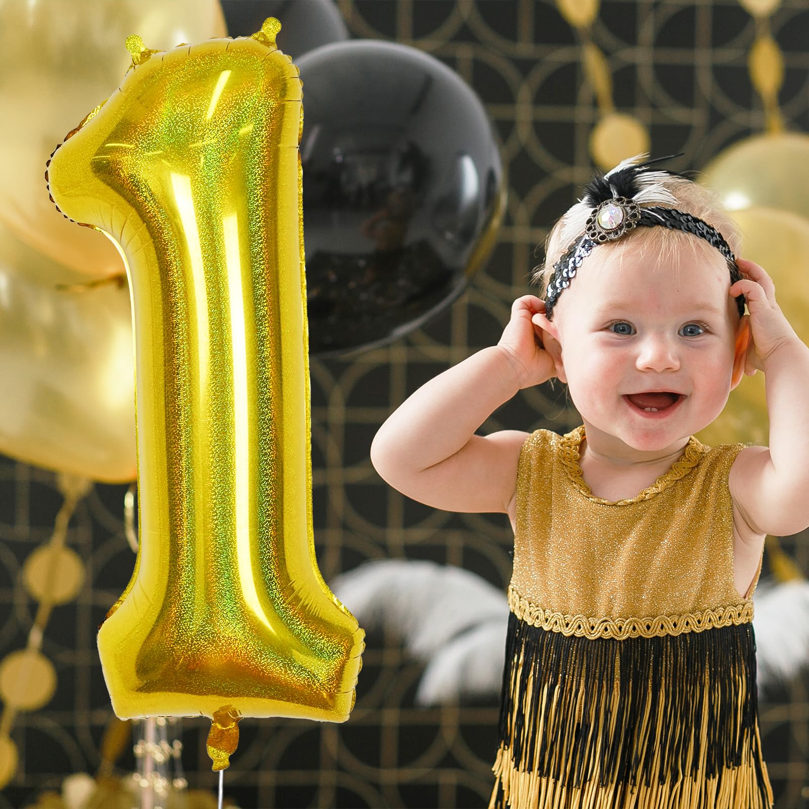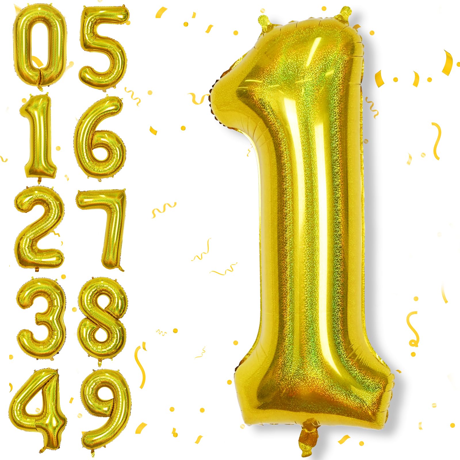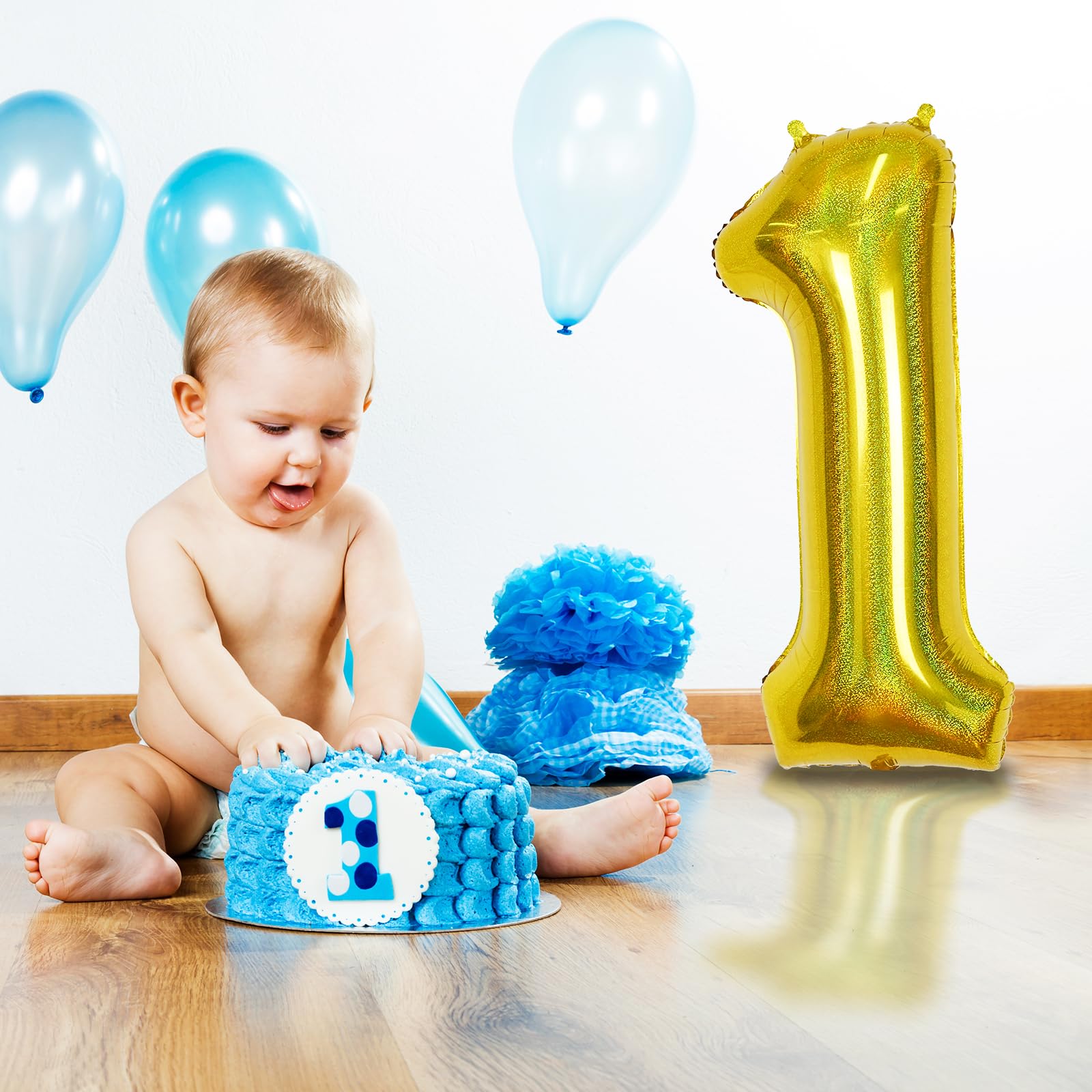 Laser Gold Number 1 Balloons, 40 Inch Foil 1 Balloons For 1 Year Old Birthday Decor, Giant Helium Self Inflating 1 Number Balloo