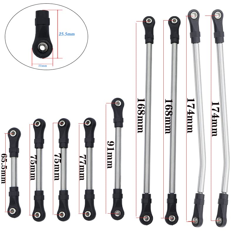 Product Description: Made of high quality stainless steel. Easy to install and durable. Unassembled Kit, easy to install. Suit for 1:10 Axial SCX10 III, Capra 1.9 UTB, SCX10 II, TRX4 Specifications: Link Rod Material: Stainless Steel Rod End Material: Plastic Net Weight: 152g(SCX10 III), 136g(Capra 1.9 UTB),139g(SCX10 II), 156g(TRX4) Package List: 1Set x Stainless Steel Linkage Unassembled Kit Notice:Pls allow 1-3mm error due to the manual measurement.