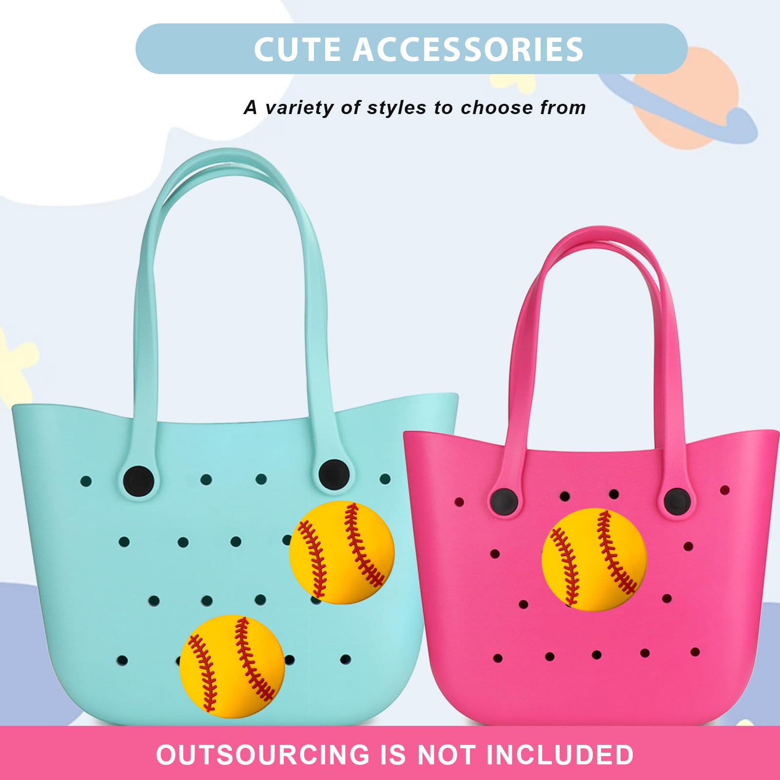 - Q: How do I attach these rubber accessories to my beach bag? A: These accessories are designed to be easily attached by gently pressing them into the holes of your rubber beach bag, which should be approximately 0.5 inches in size.