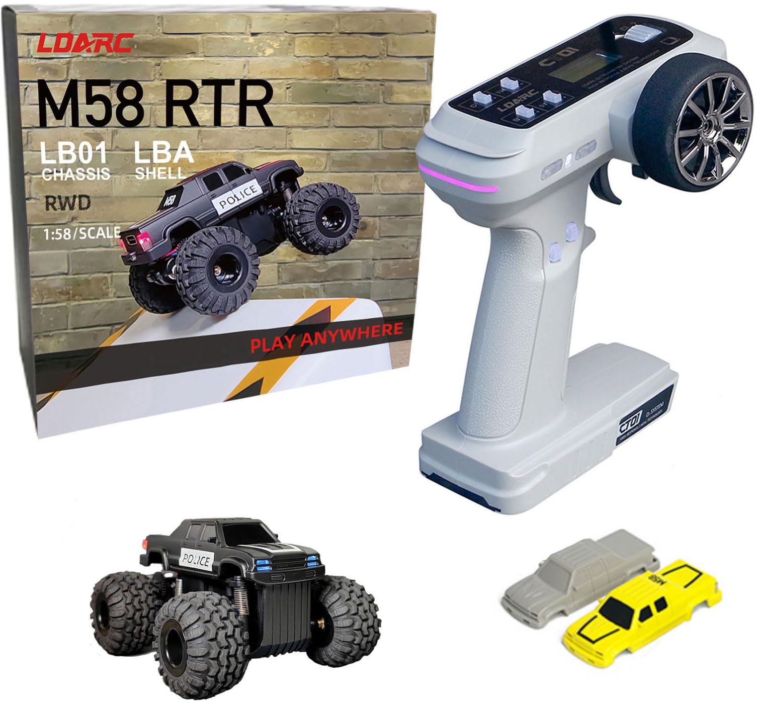Brand:LDARC Model Name:M58 Mini RC Truck ( Desktop monster Truck ) Scale:1:58 Weight:54.1g Size:75.91*66.98*45.5mm Outside tread size:66.98mm Wheelbase:45.8mm Battery (Car):3.7V 160mAh Servo:S20 Servo Motor:617 Motor (3.7V/41000RPM) Gear ratio:1:17 Tire diameter:26.9mm Min groung clereance:6.7mm Transmitter:CT01 CT01 Remote Control Transmitter 8-channel, 2.4GHz bi-directional, O2 protocol Signal reception range: 400 meters Suitable for cars, small boats, tanks 3.7V rechargeable lithium-ion battery (1 included) Weight: 227g Dimension: 165*150*90mm Screen size: 128*64mm