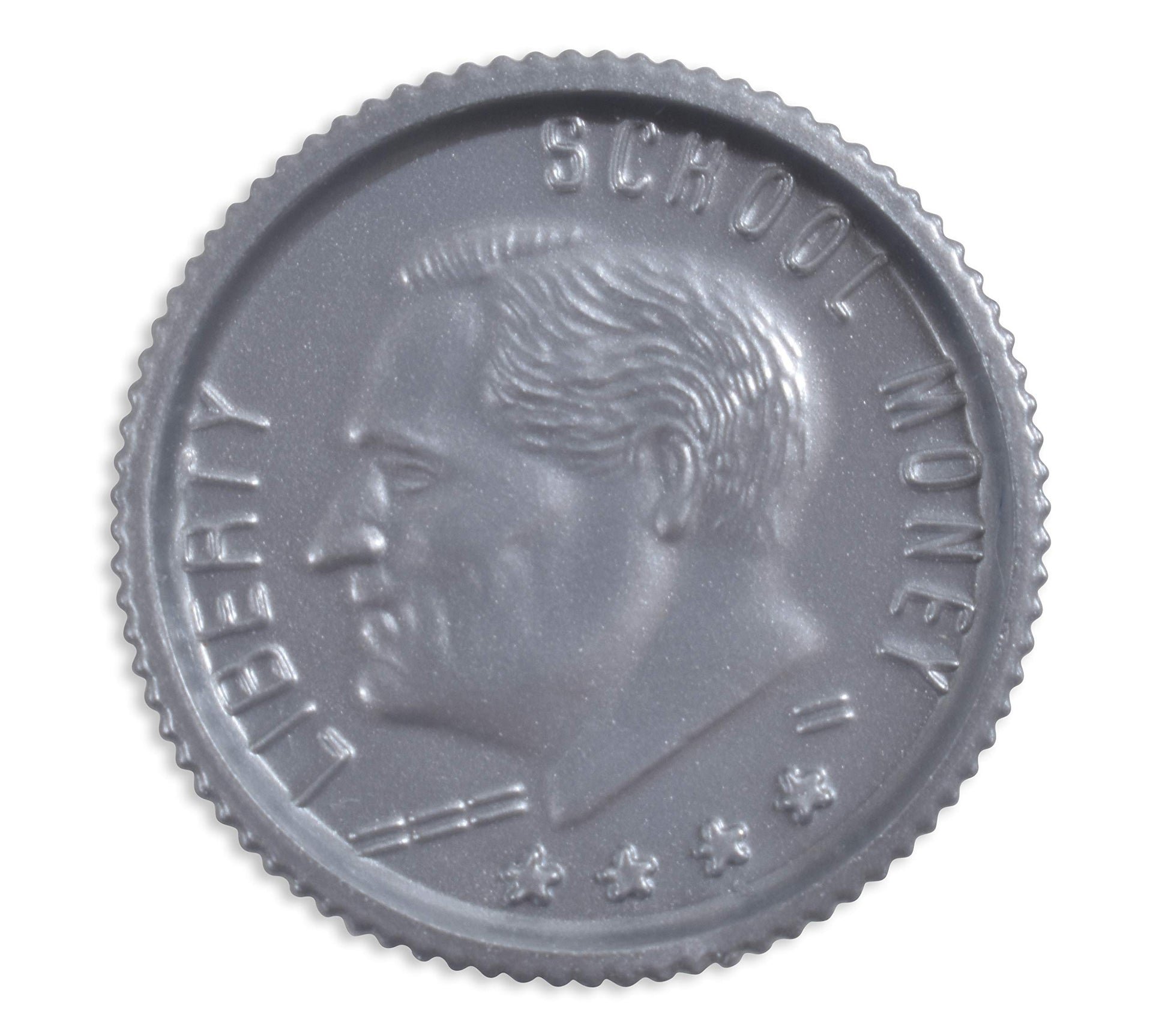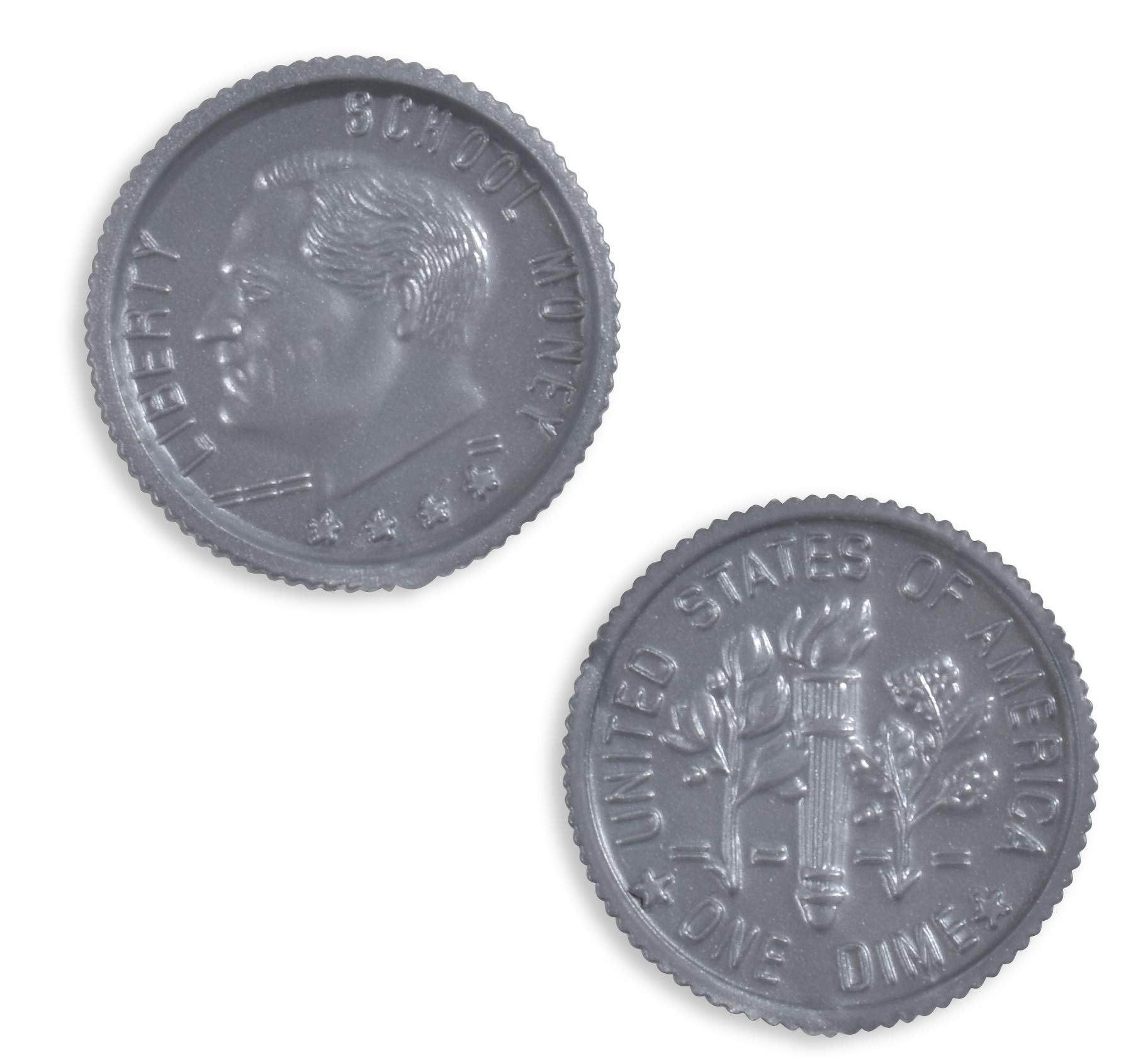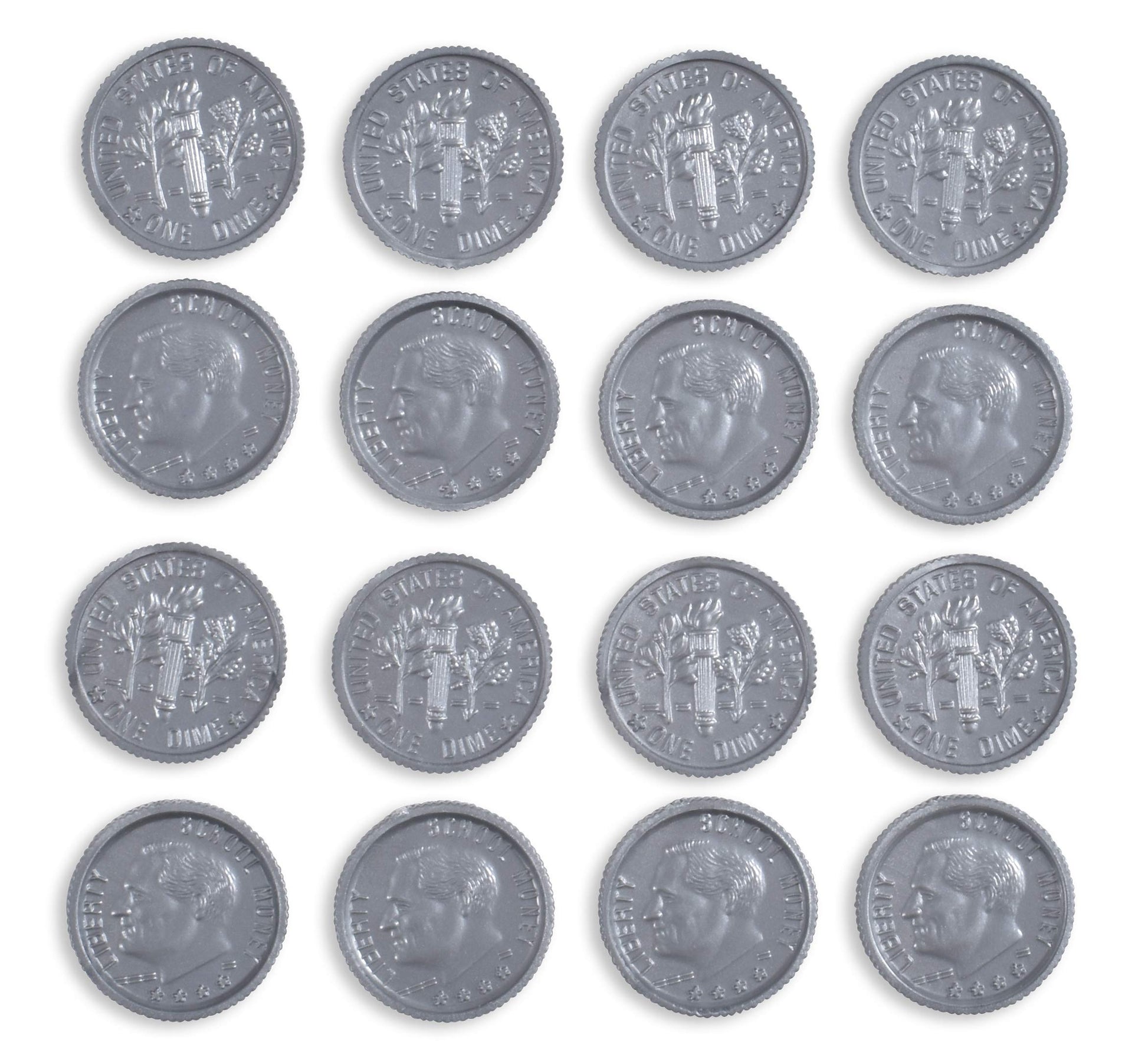 This set of 100 Play Dimes is an essential teaching and playtime resource. These realistic plastic dimes feature ridged sides, Franklin Roosevelt's face and a silver color. They are also the same size as real dimes! Children can use these coins during pretend play. Or, teach kids how to add, subtract and make change. || Size of one dime: 0.8'' dia. || Set includes: 100 play dimes.