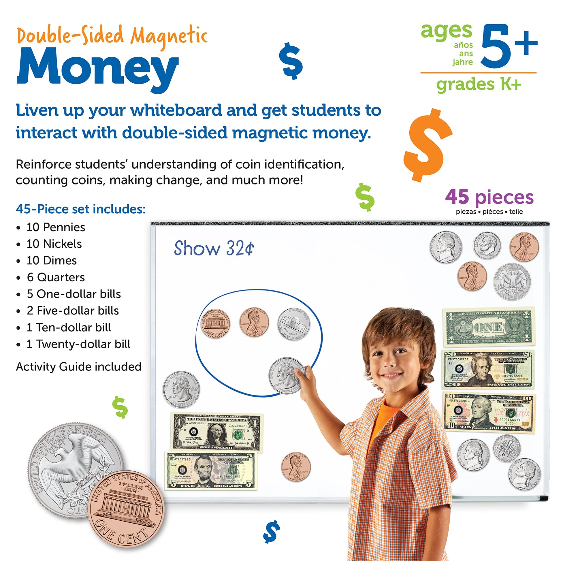 - Q: What items are included in the 45-piece set of magnetic money? A: The set includes 36 oversized coins (pennies, nickels, dimes, and quarters) at 4 times their actual size, and 9 bills (1-, 5-, 10-, and 20-dollar bills) at 1.5 times their actual size, providing a comprehensive learning experience.