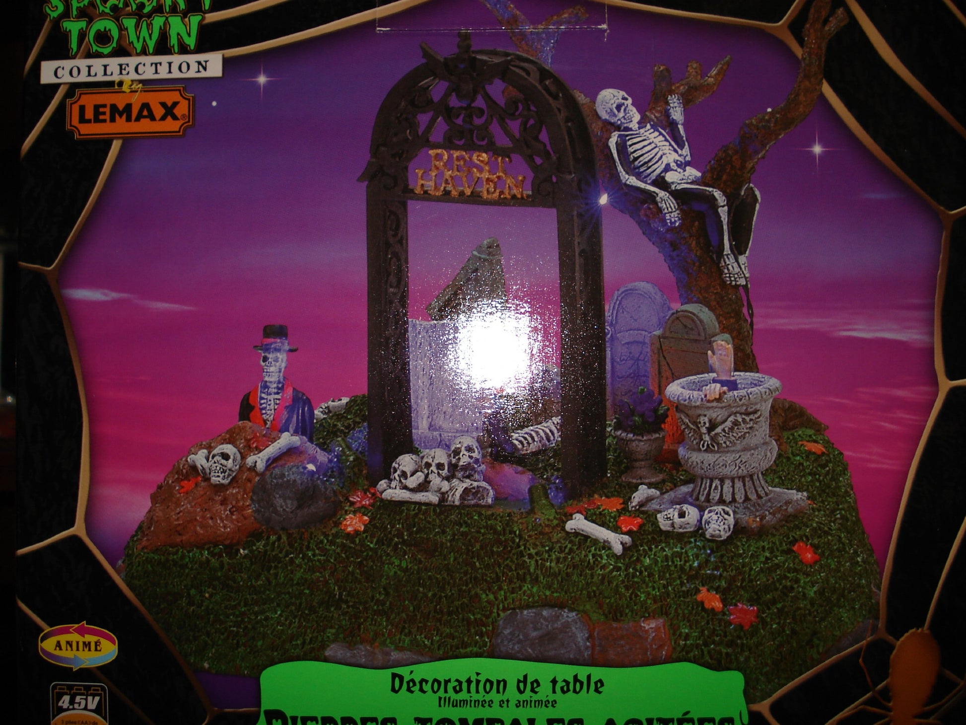 Lemax Restless Tombstones Item # 74605 Features Include: Lighted and animated table accent Tombstones go up and down Headstones sways left and right Skeleton and hand/arm come up from the earth Skeleton rises from the ashes Battery-operated Three ''AA'' size 1.5V batteries required (Batteries not included) A/C adaptable, by using Lemax Power Adaptor L44242 or L74707 This unit will draw approx. 260mA current at 4.5V DC Approx. size: ( H x W x D ) 6 3/8 x 7 7/8 x 7 1/4 inches 16.2 x 20.0 x 18.3 cm