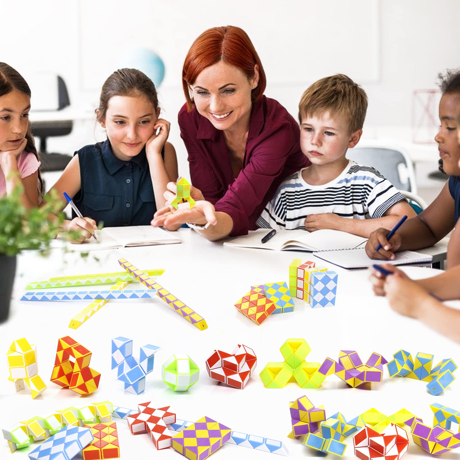 LENDOD 24 PACK Mini Fidget Snake Cube Mini Twist Puzzle Cubes Magic Speed Cubes Features: Each of the 24 mini triangle blocks can be rotated and locked in 4 directions so you can create any shapes you want such as geometric shape number symbol various animals and more. Bring challenges and fun to your fingers and brain. Not only help kids concentrate improve their practical and reasoning skills increase creativity and expand their thinking but also help promote a sense of calm reduce stress and anxiety. Good as gifts to your friends and kids great for party bag fillers and party favors. Specifications: Material: Safety Plastic Package includes: 24 x Mini Twist Puzzle Cubes Warm Notice: These mini snake cube are suitable for children above 3 years old. CHOKING HAZARD -- Small parts. Not for children under 3 yrs.