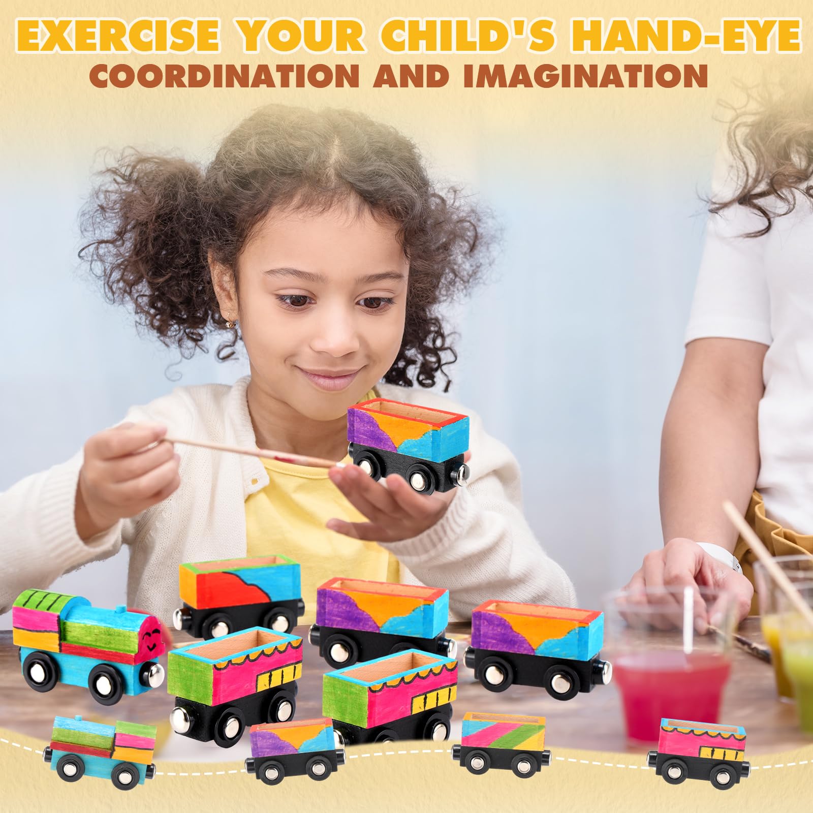 • Q: Can the wooden train cars be painted or personalized? A: Yes, the unpainted wooden train cars can be painted, tagged, and personalized with names, allowing children to express their creativity and make each train unique.