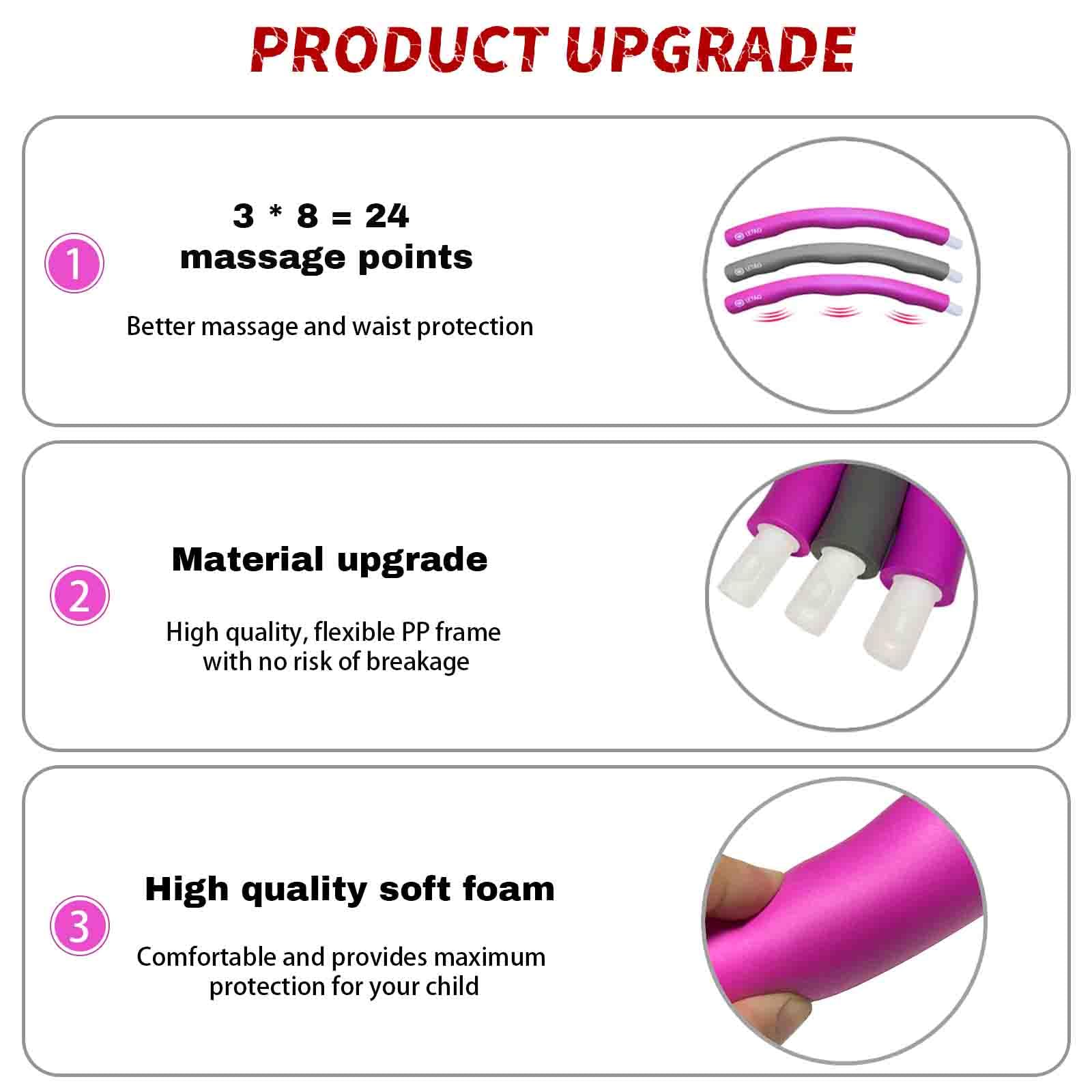 LETAO Fitness hoop for kids ages 3-8 | Rose-gray Fitness hoop for kids, can be dismantled, including electronic instructions Characteristics: Upgraded Design: 18 massage studs to better massage and tighten the waist. Comfortable thick high density sponge: protects the waist from injury. Highly elastic inner tire: durable and break-proof. Easy to assemble and portable. Training schedule: Recommended: 4-6 times a week. 2-3 sets of 10 minutes each with breaks of 10-20 minutes. Total duration: max. 45 minutes. Product specifications: Material: High density foam and PVC inner tires. Color: rose gray. Weight: 0.65kg (gross), 0.5kg (net) Size: 72cm diameter. Friendly note: Do not exercise within an hour of eating. No contact with sharp objects to protect the foam. LETAO childrens Fitness hoop: healthy exercise and fun for children aged 3-8 years.