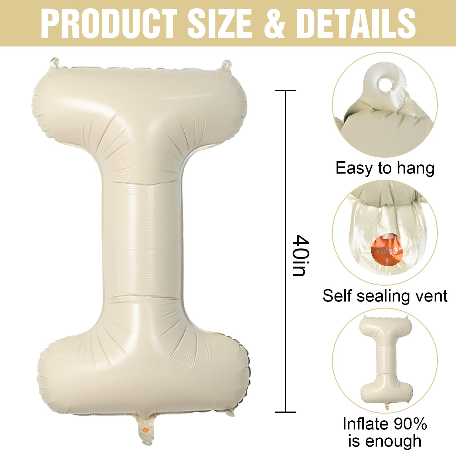 Package Content??This Set Includes 1Pc 40Inch Cream White Letter Balloon,1Pc Straw For Inflation.How To Inflate The Letter Balloons?1.Locate The Inflation Port And Insert A Straw Into The Port, This Step Is To Unclog The Port And Facilitate Inflation.2.Use An Air Pump To Inflate The Balloon.3.When Inflation Is Complete, The Inflatable Opening Will Be Sealed Automatically.How To Deflate The Letter Balloons?1. Insert The Straw Into The Inflatable Opening.2. Press The Balloon Gently And Slowly Until The Balloon Is Completely Deflated.3.Fold The Balloon After Deflation For Next Use.Warm Tips:?Please Do Not Inflate The Balloon Excessively To Avoid Explosion.?Due To Differences In Monitor Color And Product Batch Issues, Please Refer To The Actual Color Received For Accuracy.?Please Avoid Rubbing The Balloon Against Sharp Objects, Which May Cause Air Leakage.