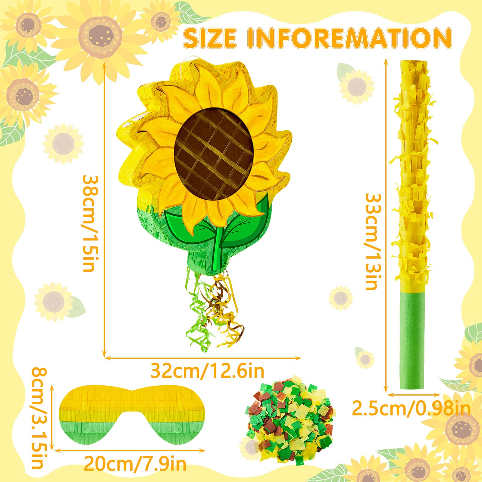 - Q: What size is the Lewtemi Sunflower Piñata and what does it include? A: The Lewtemi Sunflower Piñata measures approximately 15 x 12.6 x 3 inches. The complete set includes 1 sunflower pull string piñata, 1 blindfold, 1 piñata stick (13 inches), and 1 confetti pack, making it perfect for party games.